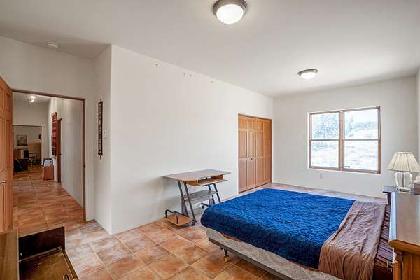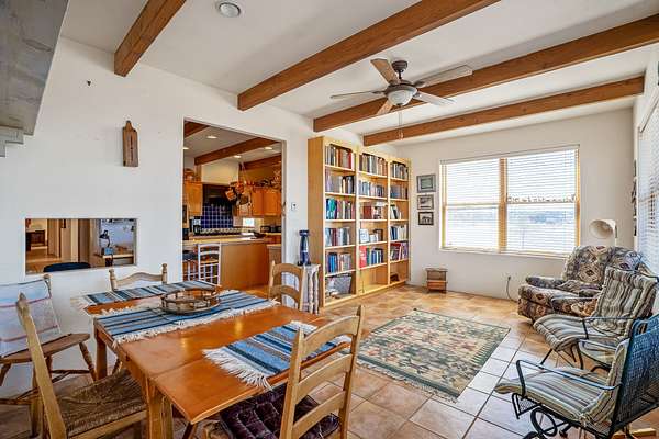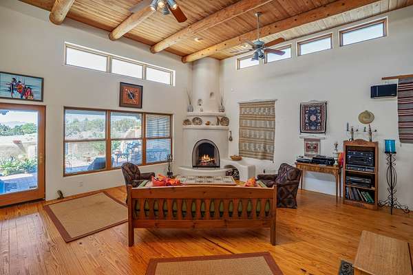 Welcome to Tierra de Casta, where spacious living meets breathtaking beauty! On five acres, with all the room you could ever desire to breathe, relax, and simply be. Step inside this homey residence, boasting over 4000 square feet of well designed space. From the moment you enter, you'll be captivated by the comfortable feeling of large rooms and soaring ceilings, all adorned with fine finishes that speak to a true sense of quality living. Prepare to be enchanted by the primary suite - it's a true sanctuary! Cozy evenings by the Kiva fireplace, with the rustic charm of vigas and tongue and groove ceilings adding a touch of authentic Southwestern warmth. The luxury bath invites you to unwind, whether you choose a soothing soak in the Jacuzzi tub or a refreshing rinse in the separate shower. Two additional generously sized bedrooms, each with its own ensuite bath, provide comfort and privacy for family or guests. Plus, a wonderfully large den, office, or library or another bedroom awaits your inspiration - for work, study, or simply curling up with a good book. The heart of the home, the great room, is truly something special. It offers breathtaking western views. From here, you have direct access to the formal dining room, where a beautifully stamped tin ceiling adds a unique and elegant touch to your gatherings. The well-appointed kitchen, featuring a spacious island, is ready for all your culinary adventures. And don't forget the sunroom! It's a cheerful spot with easy access to the rear portal, perfect for enjoying your morning coffee or evening refreshments in the fresh air. If you've been searching for a place with ample space to live, entertain, and create lasting memories, look no further. This home truly has all you need and so much more. Welcome to Tierra de Casta - we're so happy to have you!