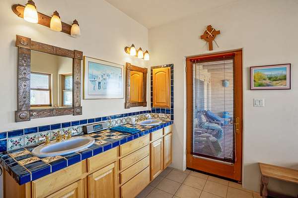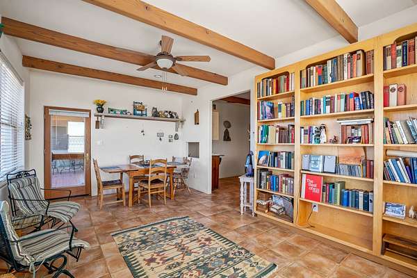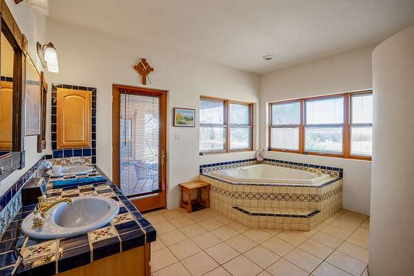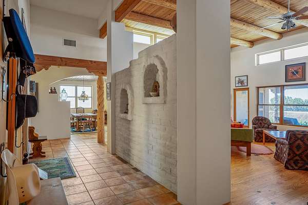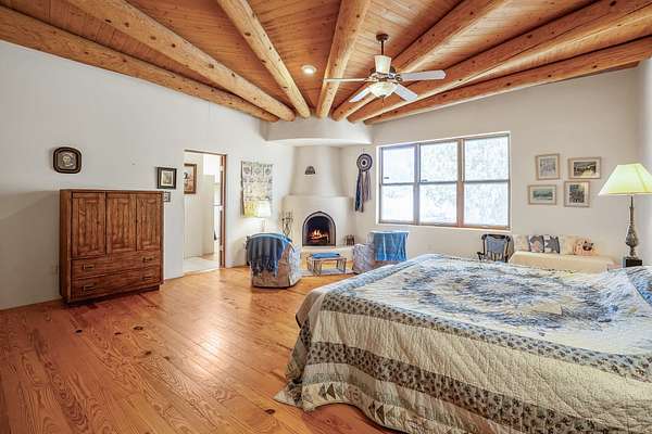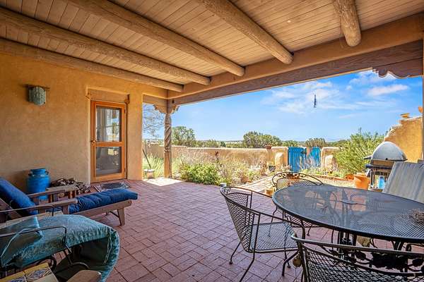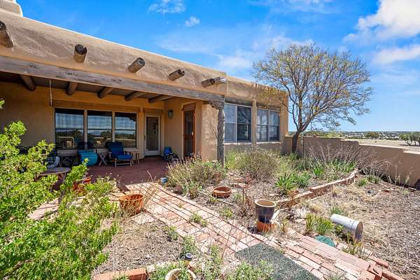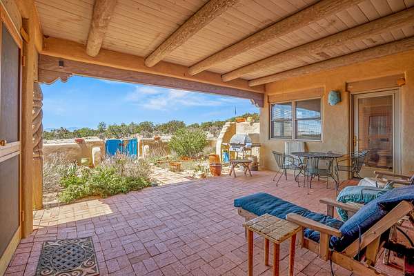 Experience unparalleled Southwestern living on five pristine acres in the exclusive Tierra de Casta area. This expansive estate offers over 4,000 square feet of meticulously designed living space, blending grand scale with the intimate warmth of traditional New Mexican architecture. Authentic Southwestern Design including High ceilings adorned with rustic vigas, tongue-and-groove accents, and hand-crafted finishes. The Primary Suite is a true retreat featuring a cozy Kiva fireplace, a spa-inspired ensuite with a jetted tub, and a custom walk-in shower. The Versatile Floor Plan Includes 2 add'l bedrooms with private ensuite baths, plus a large flexible den-ideal for a home office, library, or fourth bedroom. Well designed Kitchen with a central island and a dining room featuring an exquisite stamped tin ceiling. A bright sunroom opens to a rear portal, perfect for taking in the legendary New Mexico sunsets and western views. Situated on a lush 5-acre lot, this property provides the privacy and serenity of rural living yet near to all Eldorado Amenities and only a short drive to Santa Fe's historic Plaza. Whether you are entertaining in the grand great room or enjoying the quiet beauty of the high desert, this home is a masterpiece of comfort and quality.