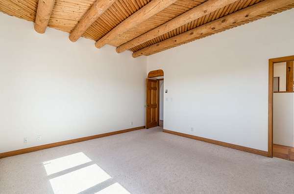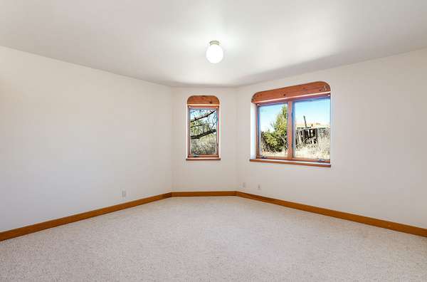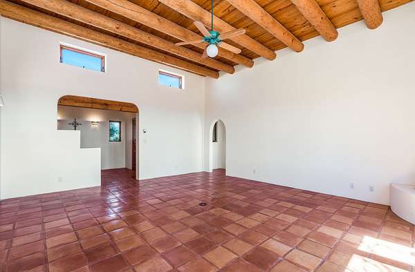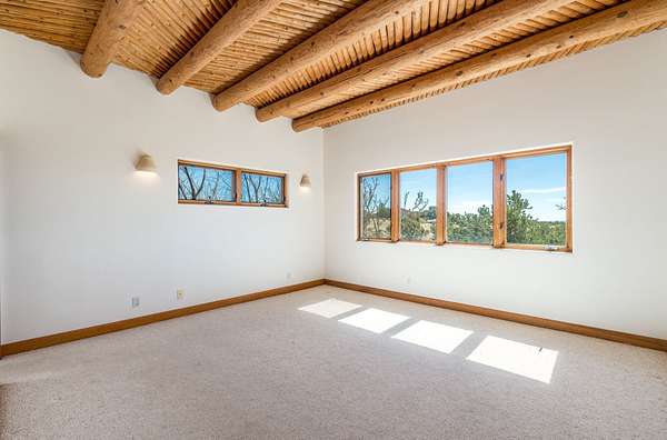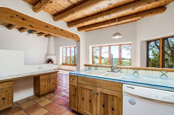 Peaceful natural beauty and classic Santa Fe style come together beautifully in this inviting home on 2.5 acres, only 15 to 20 minutes from downtown. With 1,978 square feet and a thoughtfully designed floor plan, the home offers both comfort and connection to the surrounding landscape. Deep windows stretching across the back wall frame stunning Sandia Mountain views and fill the open living, dining, and kitchen spaces with light. The living room is especially welcoming, with high ceilings, vigas over latillas, Saltillo tile floors, a corner kiva fireplace, and sliding doors that open to the lovely backyard. The bedroom layout is well planned, with two guest bedrooms and a full bath on one end of the home and a generous primary suite tucked privately on the other. A two-car attached, direct-entry garage adds convenience, while in-floor radiant heat, newer stucco, and a well-maintained roof provide peace of mind. With Sangre de Cristo Mountain views from the front and serene open space all around, this home offers the very best of country living with easy access to Santa Fe.