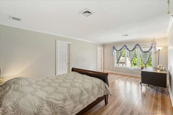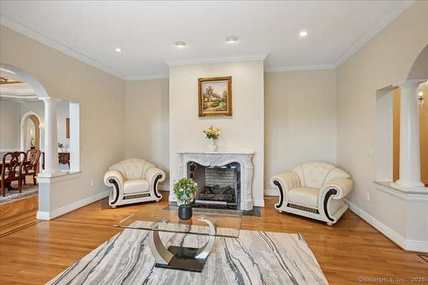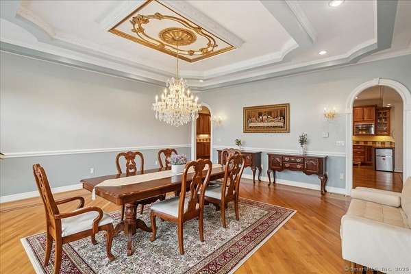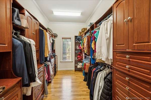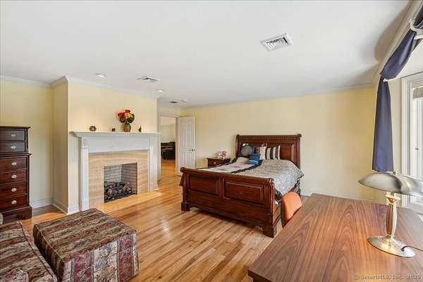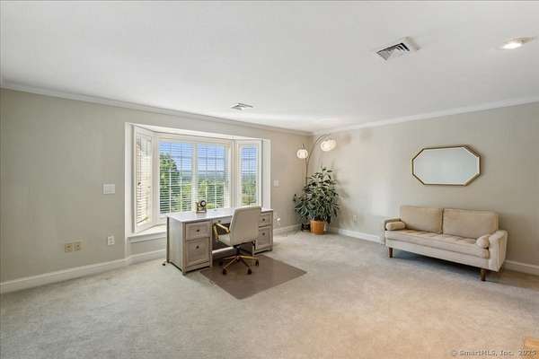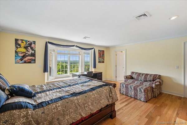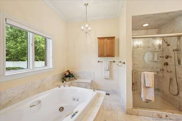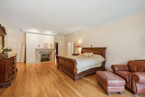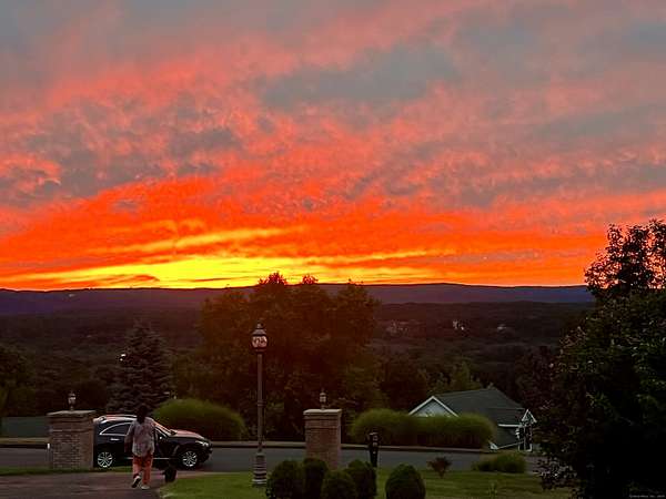 This stunning brick Colonial sits atop Hunting Ridge Drive on a sprawling two-acre level lot, offering panoramic views of the Farmington Valley and breathtaking sunsets! The back of the property features spectacular mountain views and access to a hiking trail. As you step into the two-story marble foyer, you'll be captivated by the craftsmanship and meticulous attention to detail throughout the home. The spacious chef's kitchen, spanning approximately 1,000 square feet, is a true showpiece. It boasts abundant cabinetry, ample lighting, a fireplace, a large island, and an informal dining area. The kitchen is fully equipped with two wall microwaves, two wall ovens, two dishwashers, three sinks, and two additional mini-fridges. Adjacent is a formal dining room featuring a tray ceiling and three large windows that frame the breathtaking views. The first-floor primary suite includes a Brazilian cherry wood office/library, while the second-floor primary suite includes its own private study or office space. Additional highlights of this exquisite home include seven fireplaces, 10-foot ceilings on the first floor, a circular driveway, a large Trex deck, a flat backyard, and a finished lower-level recreation room. Simsbury was recently ranked as one of the "Best Small Towns in Which to Live" by Money Magazine, with its many cultural events, top-rated school system, and preserved open spaces.