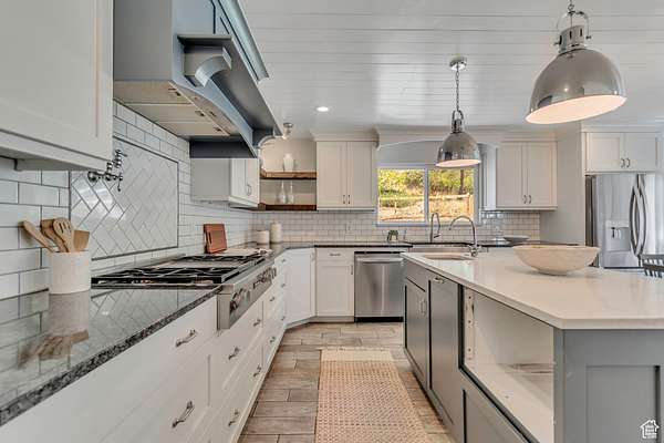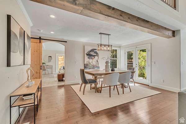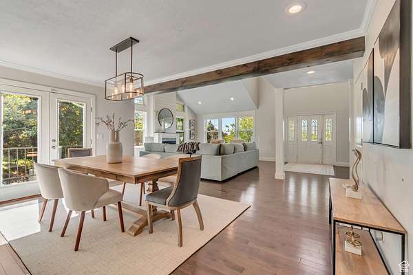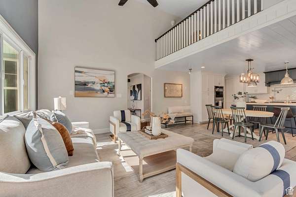 Don't miss this rare custom 2-story home nestled atop Mapleton's desirable east bench, perfectly situated on 2.5 acres. Bright, inviting and open floor plan provides elegance, functionality and modern design. Formal living room with vaulted ceilings, gas fireplace and updated metal stair railing and the spacious dining room are perfect for entertaining and holiday gatherings. Remodeled gourmet kitchen has white shaker cabinets, quartz countertops, gas cooktop, double ovens, subway tile backsplash, pot filler and pantry. Island with second sink provides additional seating and workspace. The chef inspired kitchen opens to a generous great room. THREE PRIMARY SUITES, all with ensuite bathrooms and walk-in closets makes this home perfect for multi-generational living. Step outside your private retreat from the main floor and 2nd level primary suites to private decks to enjoy the fresh air and sweeping unobstructed mountain views. The flexible finished basement can be used as an ADU or as part of the main home and features separateentrance, 2 large bedrooms, theater room, recreation room, office, kitchen and 2 bathrooms. Hiking trails right outside your backdoor. Expansive wraparound deckextends living areas outdoors and showcases the serenity of nature, perfect for taking in the sunset and mountain scenery. Secluded lot with raised garden boxes, pressurized irrigation and RV parking.Zoned A2 with animal rights. This home is ready to impress. Buyer to verify all information