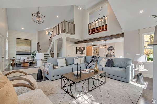 Don't miss this rare custom 2-story home nestled atop Mapleton's desirable east bench, perfectly situated on 2.5 acres. Bright, inviting and open floor plan provides elegance, functionality and modern design. Formal living room with vaulted ceilings, gas fireplace and updated metal stair railing and the spacious dining room are perfect for entertaining and holiday gatherings. Remodeled gourmet kitchen has white shaker cabinets, quartz countertops, gas cooktop, double ovens, subway tile backsplash, pot filler and pantry. Island with second sink provides additional seating and workspace. The chef inspired kitchen opens to a generous great room. THREE PRIMARY SUITES, all with ensuite bathrooms and walk-in closets makes this home perfect for multi-generational living. Step outside your private retreat from the main floor and 2nd level primary suites to private decks to enjoy the fresh air and sweeping unobstructed mountain views. The flexible finished basement can be used as an ADU or as part of the main home and features separateentrance, 2 large bedrooms, theater room, recreation room, office, kitchen and 2 bathrooms. Hiking trails right outside your backdoor. Expansive wraparound deckextends living areas outdoors and showcases the serenity of nature, perfect for taking in the sunset and mountain scenery. Secluded lot with raised garden boxes, pressurized irrigation and RV parking.Zoned A2 with animal rights. This home is ready to impress. Buyer to verify all information