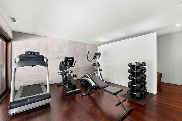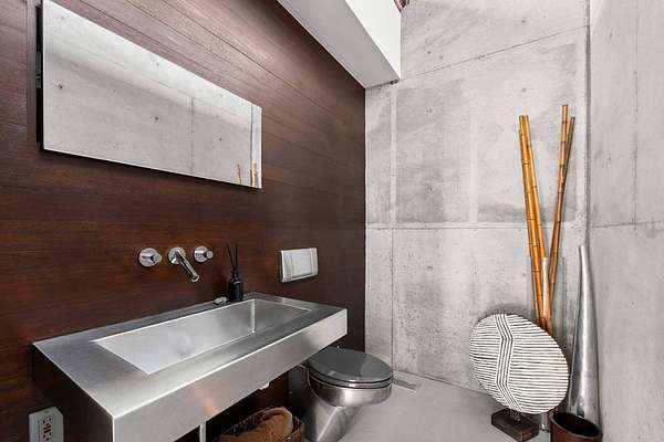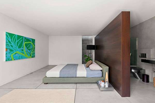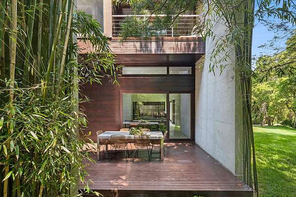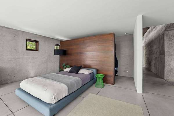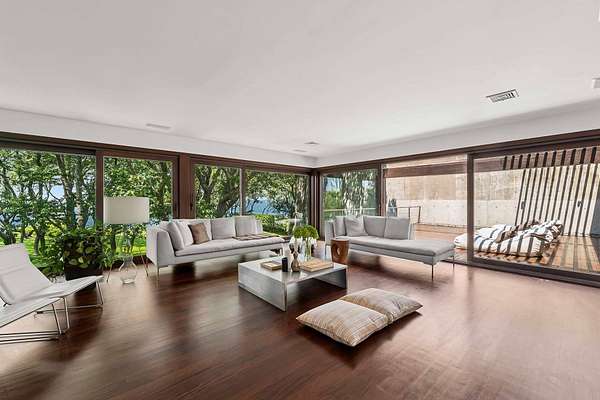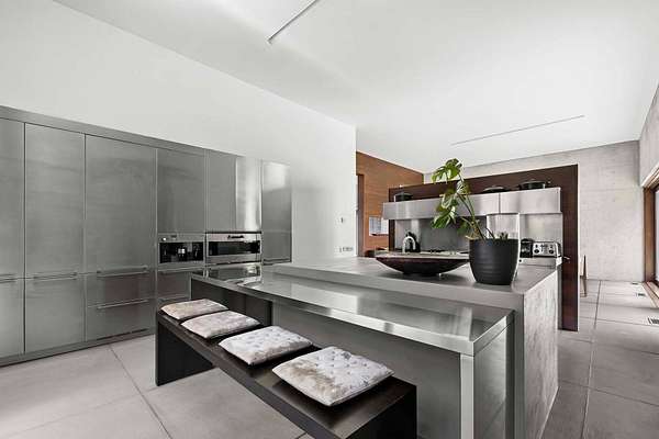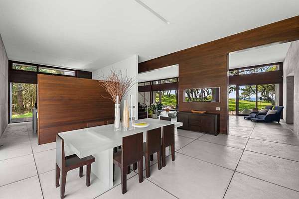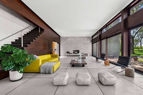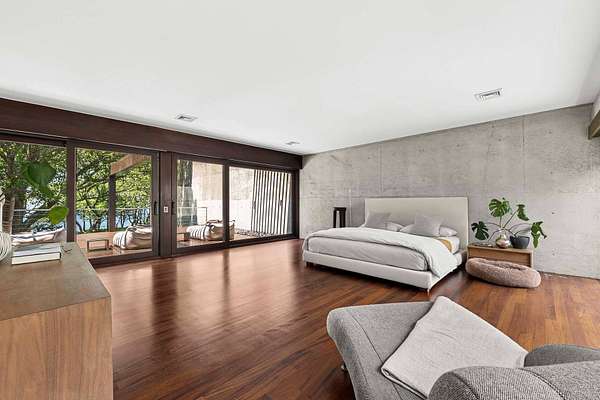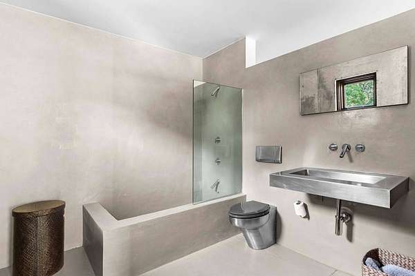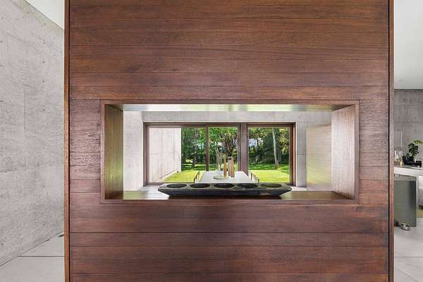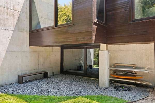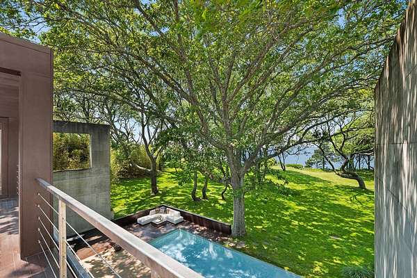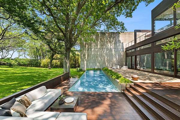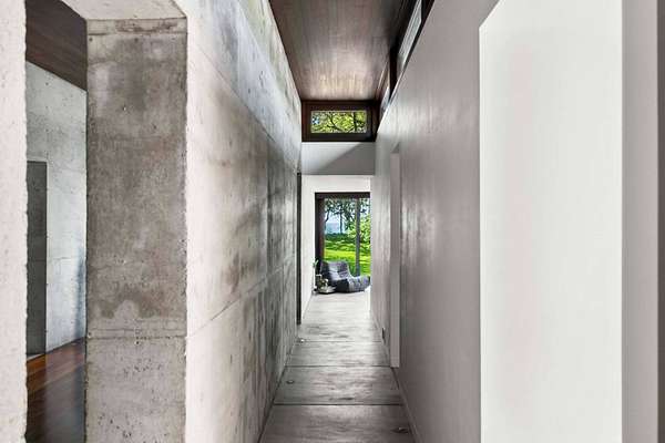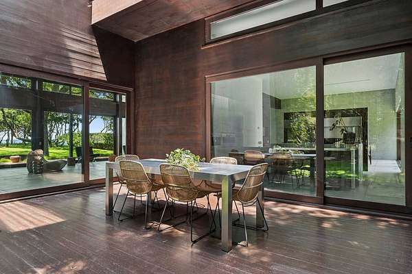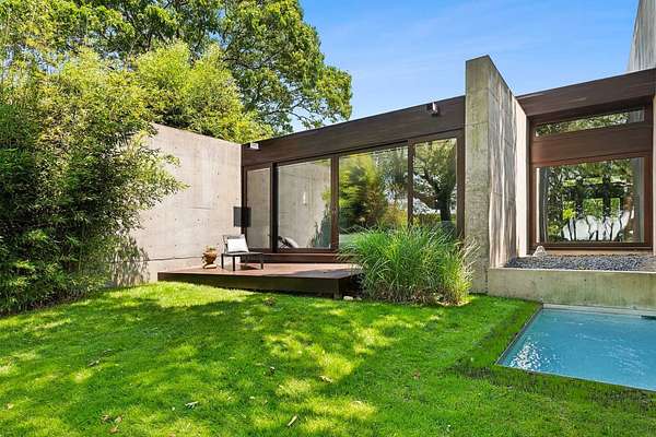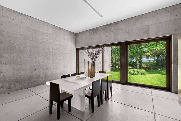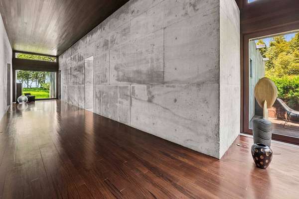 In a secluded setting in North Haven, this unique home offers sweeping views across pristine Noyac Bay to Shelter Island, as well as privacy among the trees on the two-acre property. The epitome of simple modern elegance, the home designed by architect William Reese in close cooperation with the homeowners is inspired by modernist design masters such as Tadao Ando and Rudolf Schindler. It employs simple lines and geometric shapes, executed in four materials - concrete, steel, glass and mahogany. Expressed in a limited palette of neutral colors, the home supports a modern lifestyle and provides amenities such as a gym, heated pool, sauna, tennis, private stair access to the beach and a boat mooring! The open floor plan allows spaces to flow into one another, and surprisingly provides privacy from room to room. The gracious master suite is accessible by a private stairway and includes a waterfront deck and den. There are four additional ensuite bedrooms plus two additional baths as well. Outside the home one can see the five powerful long concrete walls extending beyond the footprint of the house and graciously nestling the dark wood house frame. Together, the structure embraces the natural and serene landscape which envelops the property. The feeling captured here, both indoors and out, is simultaneously bold and peaceful and must be experienced to be fully understood. Expandable to over 8,000 sq.ft.! This precisionist modern dream home has been featured by Metropolitan Home Magazine and Elle Decor.
