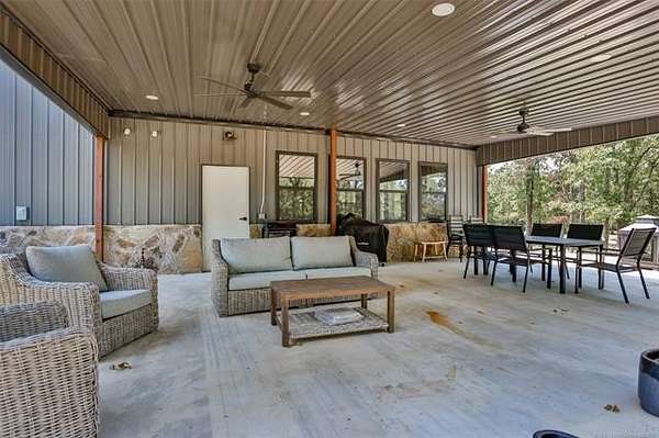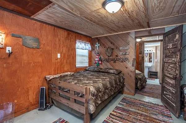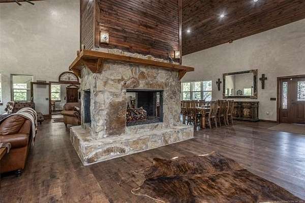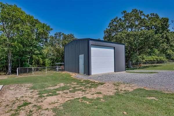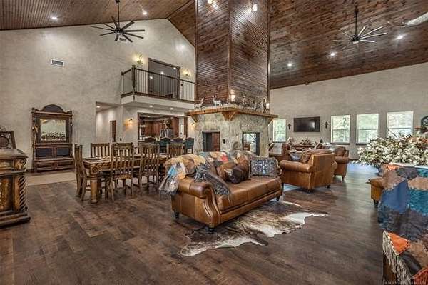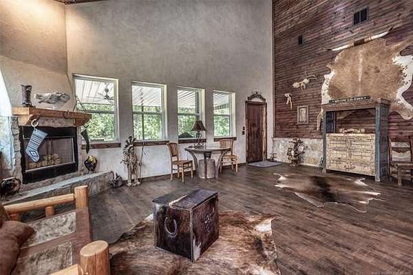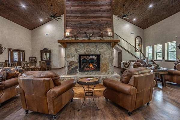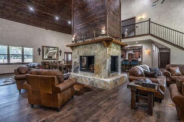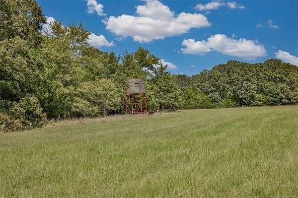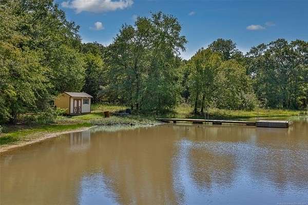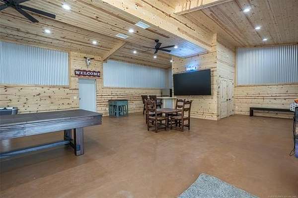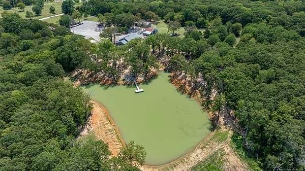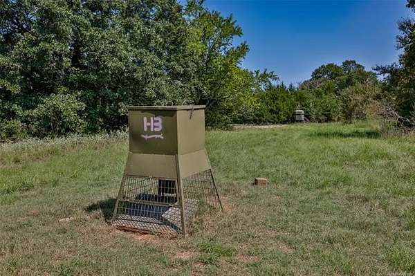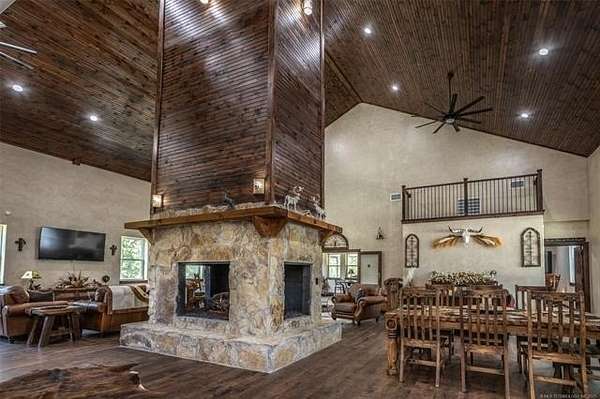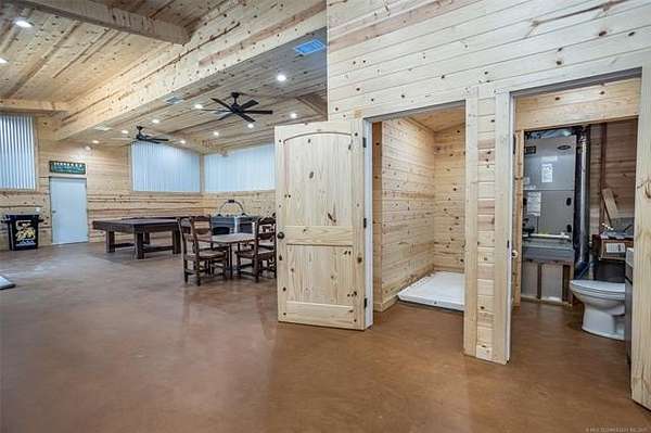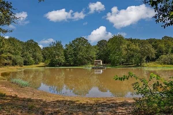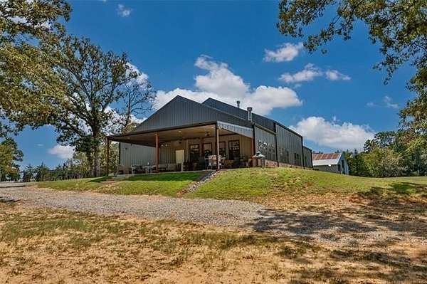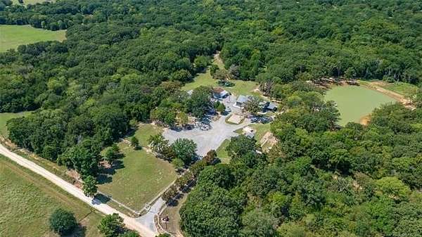 Welcome to one of Oklahoma's premier luxury hunting lodges--240 Magnolia Lane, a 146-acre retreat custom-built for the serious outdoorsman and those who entertain at the highest level. This one-of-a-kind estate combines world-class recreational amenities with refined lodging and gathering spaces, making it ideal for private use, corporate retreats, or high-end group hosting. Trophy whitetail deer, wild hogs, turkey, and ducks roam the hardwood-rich terrain, which includes multiple deer stands, miles of ATV trails, two stocked ponds, and a creek with a steel bridge crossing. At the heart of the property is an expansive main lodge featuring vaulted ceilings, rich woodwork, and a dramatic four-sided stone fireplace that anchors an expansive great room with open dining and multiple seating areas. The chef's kitchen is designed for entertaining, and each bedroom includes a private en-suite bath for guest comfort. A large 60x30 event-ready climate-controlled party barn features a bar, bathroom, and storm shelter. Additional lodging includes a restored bunkhouse with fireplace, full bath, and sleeping for four. A large pole barn stores all recreational equipment and vehicles. Six RV hookup sites accommodate overflow guests. Outdoor gathering areas include a covered porch overlooking the pond, a firepit, outdoor bar, and horseshoe pit. This exclusive property is offered fully operational, with furnishings, decor, and equipment available at additional cost. Conveniently located just 1.5 hours from McKinney, Texas, and 30 minutes from Choctaw Casino, this exceptional retreat provides easy access while maintaining complete privacy and seclusion.