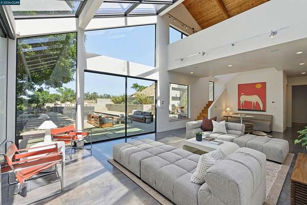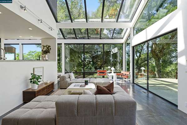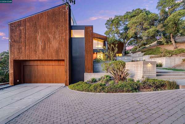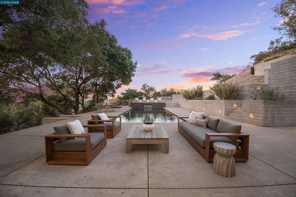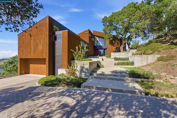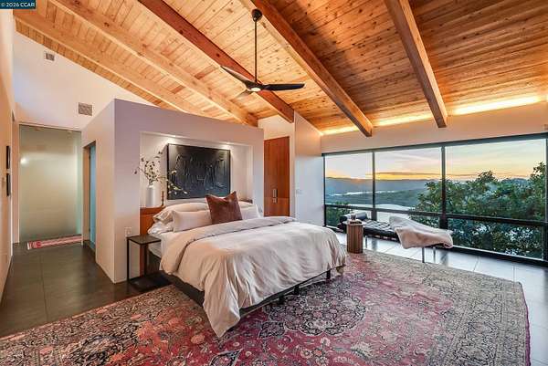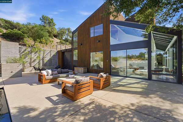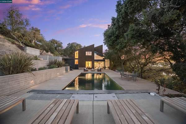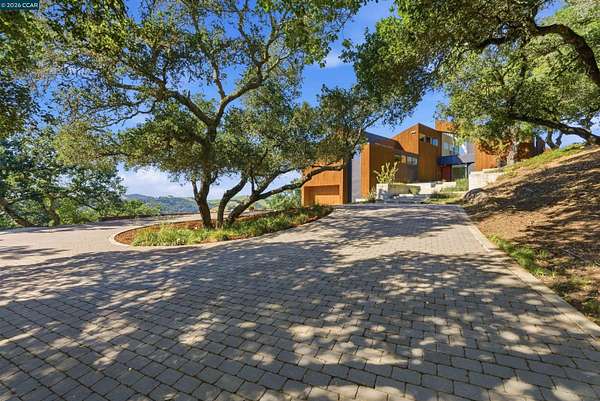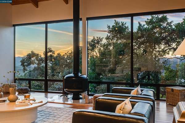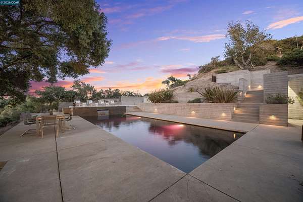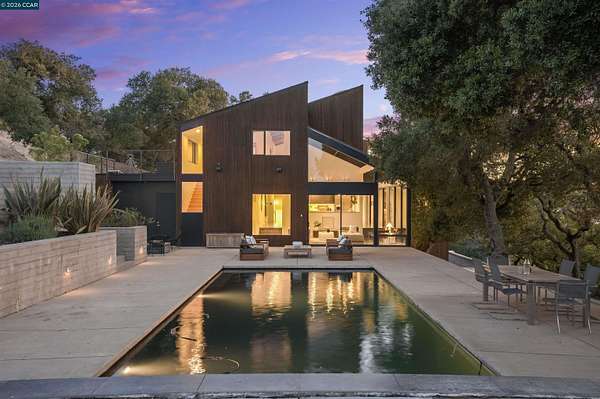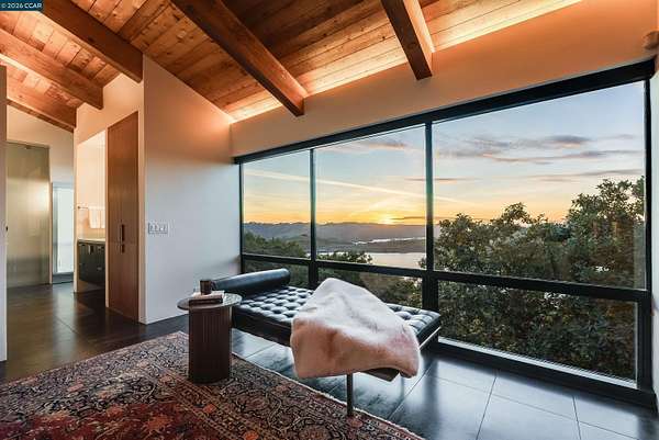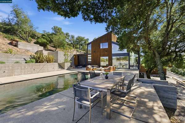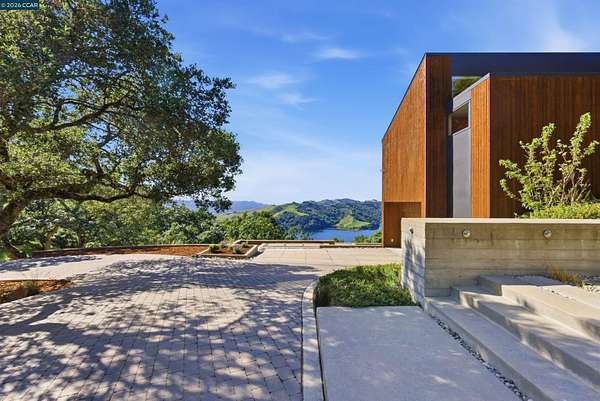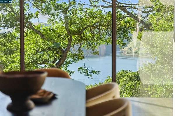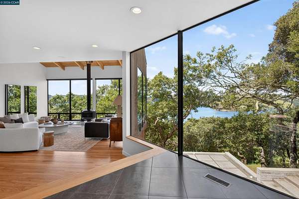 Once in a while, a home comes along that genuinely stops you. 240 Tappan Lane is that home. A long cobblestone drive winds beneath a canopy of Valley oaks before this stunning 6,800 sq ft contemporary comes into view. Set on 4.63 private acres above Briones Reservoir, the architecture is striking inside and out, cedar and steel exterior, glass and light throughout. The entry sets the tone immediately with floor to ceiling windows framing the reservoir through the oaks, and Porcelanosa porcelain tile underfoot. To the left, the living room opens up with warm oak floors, an exposed cedar beam ceiling, and walls of glass that keep that view front and center. The heart of the home is the great room, where a full glass roof and floor to ceiling sliding walls open the living space directly to the pool terrace and the oaks beyond. The kitchen is thoughtfully designed with dark cabinetry, granite counters, and a gas cooktop island that looks out over the living area without being separated from it. Two bedrooms on the main floor including a primary suite keep daily living entirely on one level. A second primary suite upstairs is perfect for guests or family. Six bedrooms and six and a half baths in total, finished with real care throughout, including a spa shower tiled in graphite porcelain. The home theater is its own world, lined with framed vintage film posters and purpose built for movie nights that actually matter. Outside, a sleek pool sits within terraced concrete gardens surrounded by mature trees, with the reservoir and rolling hills as a backdrop. A four car garage and expansive motor court complete the picture. Minutes to top rated schools and downtown Orinda.