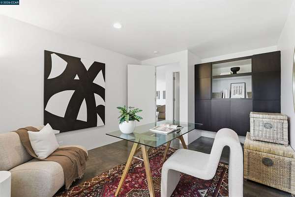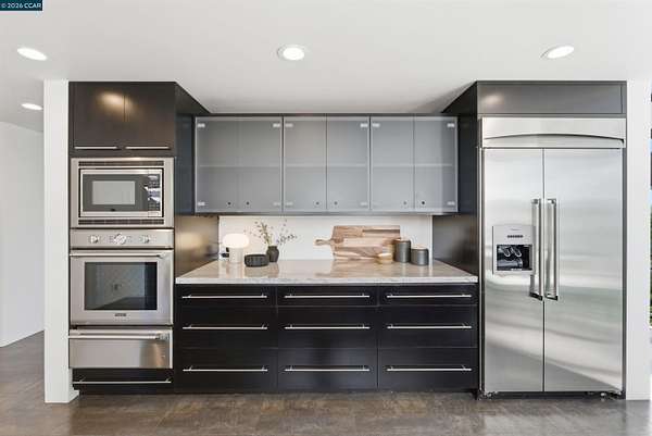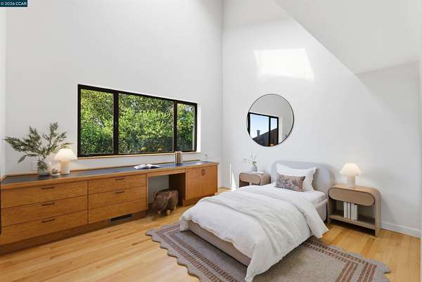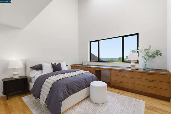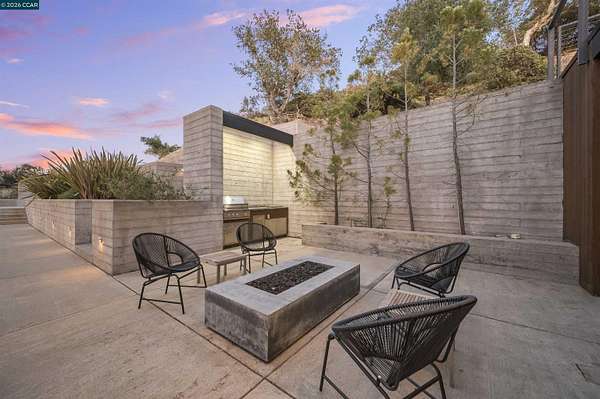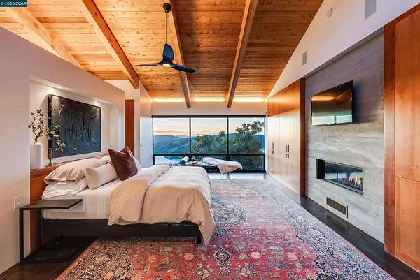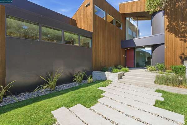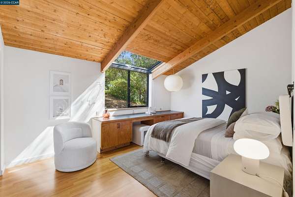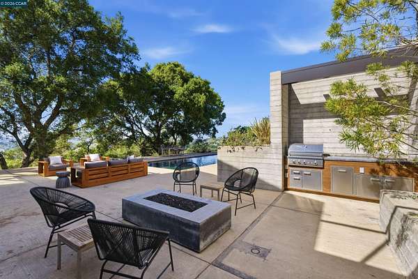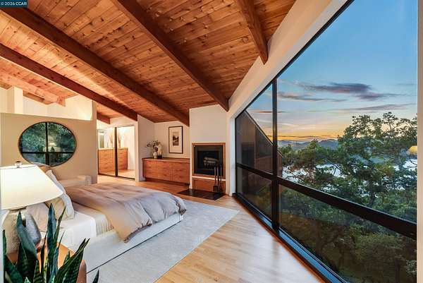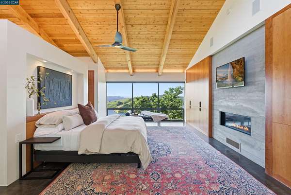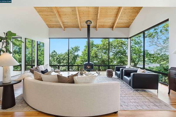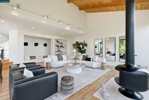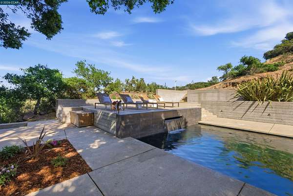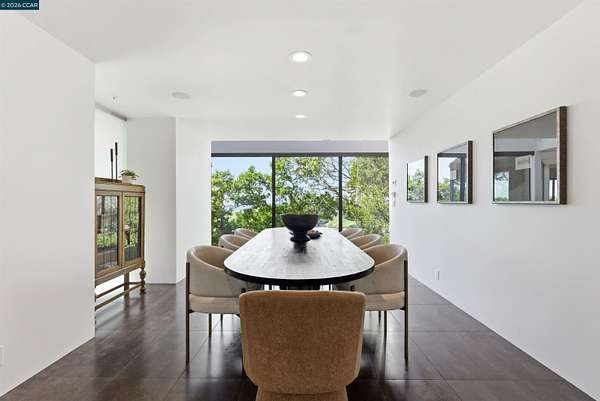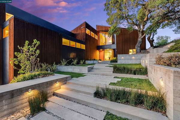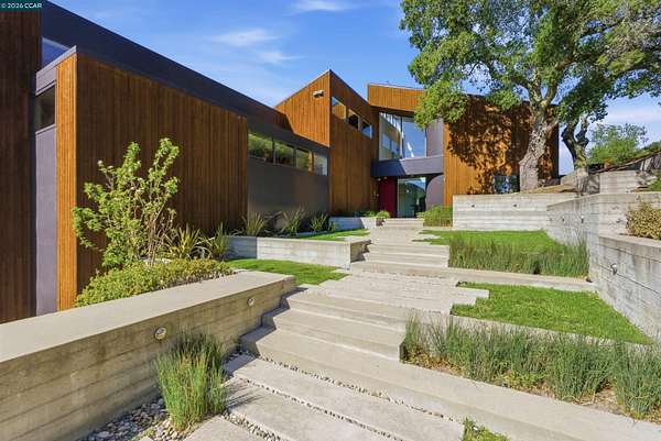 Once in a while, a home comes along that genuinely stops you. 240 Tappan Lane is that home. A long cobblestone drive winds beneath a canopy of Valley oaks before this stunning 6,800 sq ft contemporary comes into view. Set on 4.63 private acres above Briones Reservoir, the architecture is striking inside and out, cedar and steel exterior, glass and light throughout. The entry sets the tone immediately with floor to ceiling windows framing the reservoir through the oaks, and Porcelanosa porcelain tile underfoot. To the left, the living room opens up with warm oak floors, an exposed cedar beam ceiling, and walls of glass that keep that view front and center. The heart of the home is the great room, where a full glass roof and floor to ceiling sliding walls open the living space directly to the pool terrace and the oaks beyond. The kitchen is thoughtfully designed with dark cabinetry, granite counters, and a gas cooktop island that looks out over the living area without being separated from it. Two bedrooms on the main floor including a primary suite keep daily living entirely on one level. A second primary suite upstairs is perfect for guests or family. Six bedrooms and six and a half baths in total, finished with real care throughout, including a spa shower tiled in graphite porcelain. The home theater is its own world, lined with framed vintage film posters and purpose built for movie nights that actually matter. Outside, a sleek pool sits within terraced concrete gardens surrounded by mature trees, with the reservoir and rolling hills as a backdrop. A four car garage and expansive motor court complete the picture. Minutes to top rated schools and downtown Orinda.