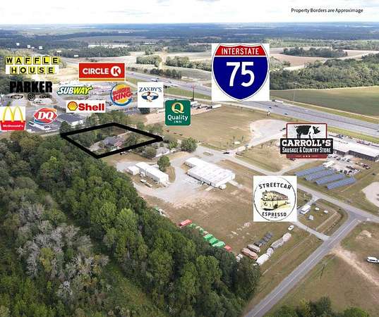 1.73 acres of prime land with direct visibility and easy access from I-75 The property is positioned near Carroll's Sausage, GA Peanut RV Park and other established businesses, making it an ideal location for commercial growth. The main 2902 sqft. brick building includes a walkout basement and oversized 2 car garage, currently operating as a boutique. Additional improvements include a former salon building and a steel structure, both well-suited for lease or conversion. An undeveloped corner portion of the property provides room for future expansion. Currently zoned General Commercial. This tract offers options for both investors and owner-occupants: lease existing buildings, establish your own business with unmatched interstate exposure, or develop further to maximize return. With its I-75 frontage, high traffic counts, and growth potential, this property is built for long-term success. Merchandise and furnishings do not convey.