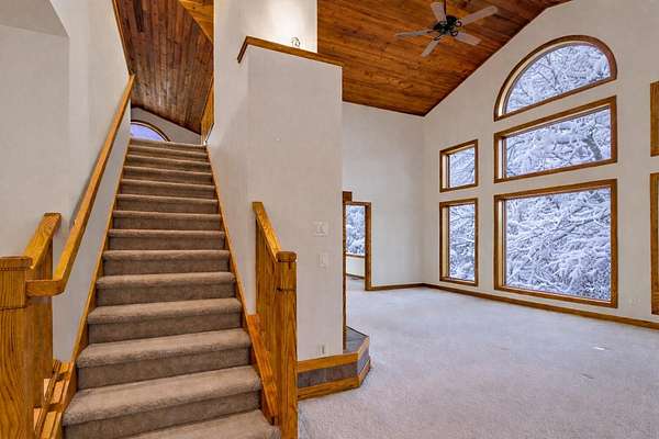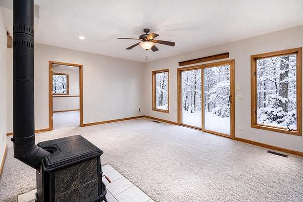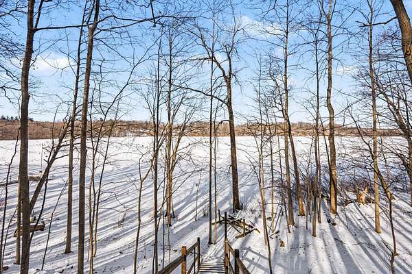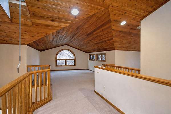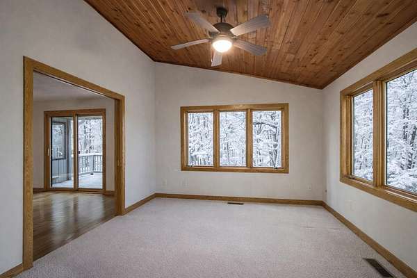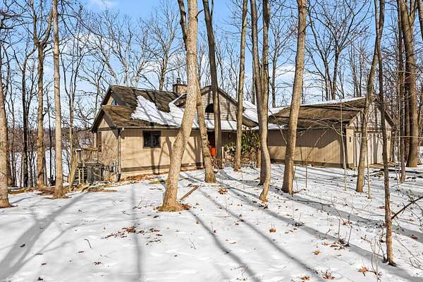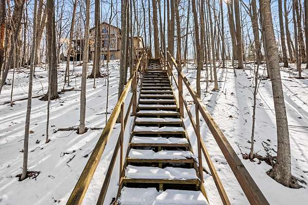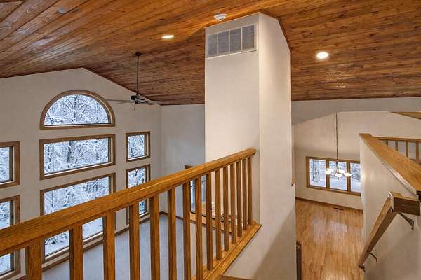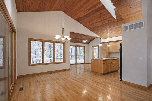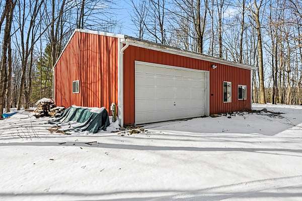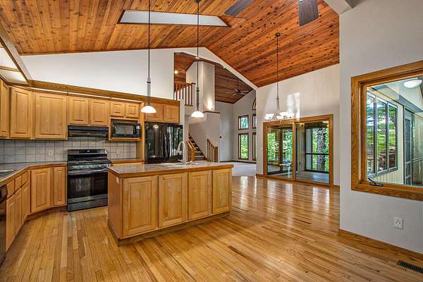 Escape to this secluded 5.5-acre Muskrat Lake retreat, where 234 feet of private, sandy waterfront and crystal-clear waters await. This custom-designed contemporary home blends modern luxury with rustic charm. Step inside to a gracious soring 2 story entry, a stunning Great Room featuring dramatic vaulted ceilings bathed in natural light through expansive windows and skylights. The chef's kitchen is a masterpiece of design, complete with granite counter tops, prep island, hardwood floors, flow seamlessly into an inviting cedar-screened porch and grilling deck for effortless entertaining. Retreat to the to the main-floor primary ensuite, a true sanctuary featuring a private balcony, a double vanity, a whirlpool bath a tiled walk in shower and generous walkin closet. The versatile walk out basement adds a significant living space with a large family room, woodburner and additional generous bedrooms and a full bath. Hobbyists will love the workshop or use it for a recreation room. A massive pole barn which previously housed guest quarters Needs to be brought back to life. Outdoor living is unmatched, featuring a private beach changing and storage, a lakeside bonfire area for starry night, fish off the dock for some of the best fishing on the lake, This one owner gem is the perfect balance of "gracious living" and natural beauty.