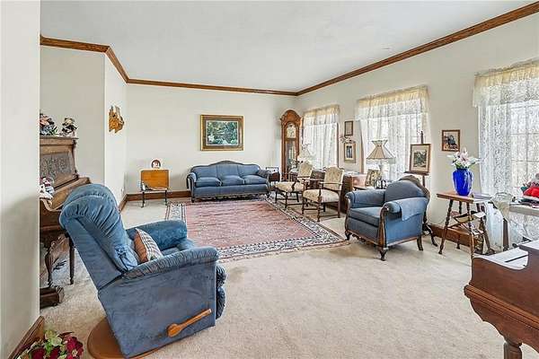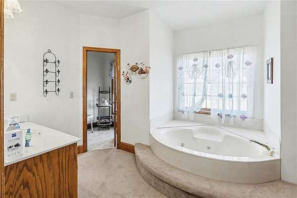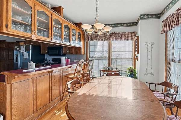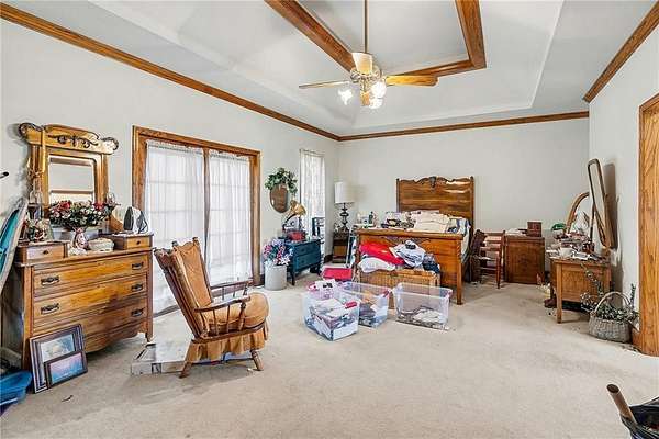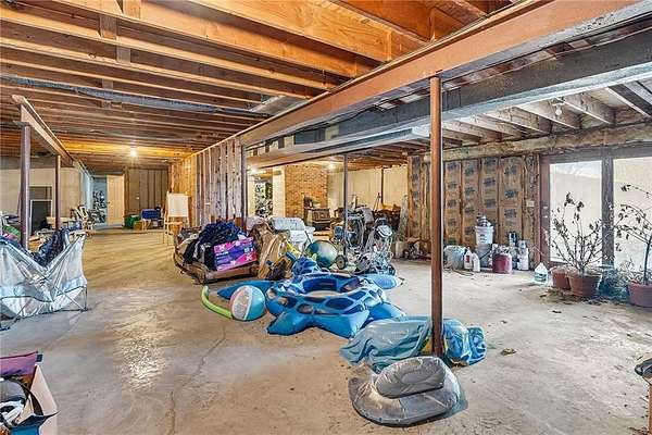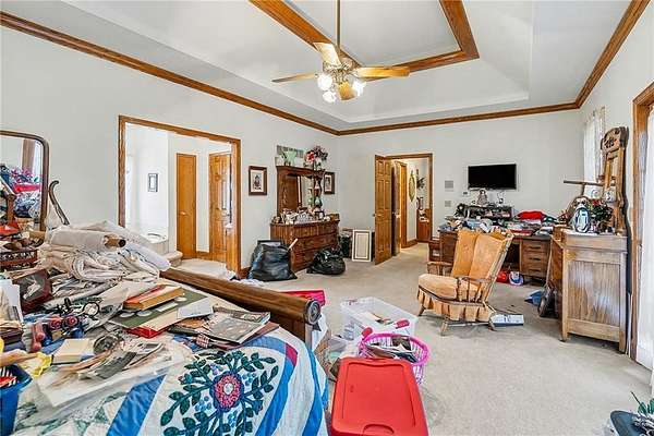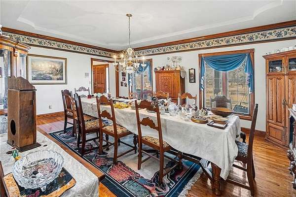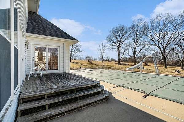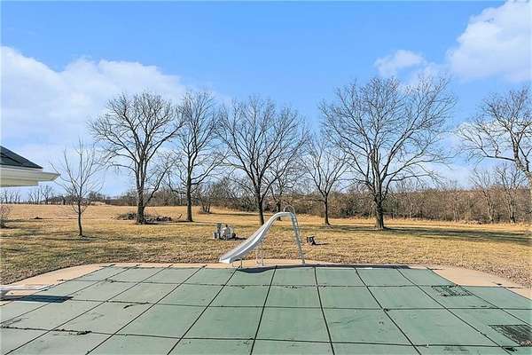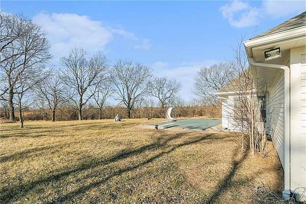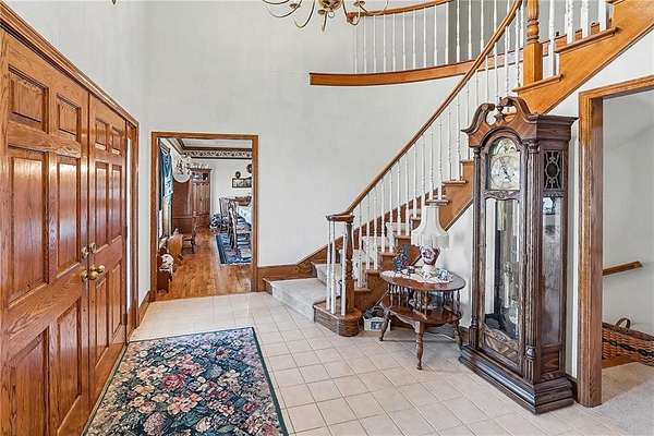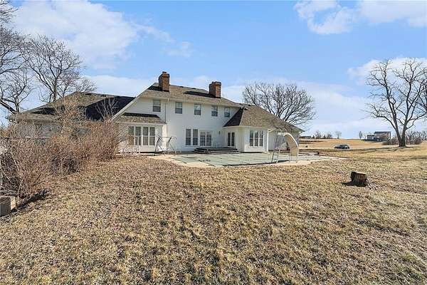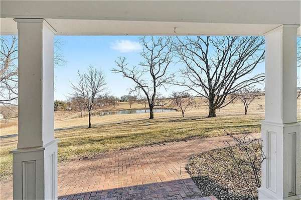 Situated on 10+/- acres in the Smithville School District, this expansive 1.5-story estate offers 3,900+/- square feet of living space, timeless character, and endless potential. The property features a unique barn highlighted by burned wood joists reclaimed from the historic 1917 Kansas City Stockyard Fires, adding a rare touch of history and charm. A grand double-door entry opens to a stunning two-story foyer with a curved staircase leading to the upper level. The formal dining room off the entry is generously sized, perfect for hosting large gatherings. The kitchen offers abundant cabinet space, a walk-in pantry conveniently located near the laundry room, an eat-in breakfast nook with peaceful backyard views, and a wood-burning fireplace. Multiple living areas provide flexibility, including an informal family room with fireplace for relaxed evenings and a formal living room ideal for entertaining. A main-level study with its own fireplace creates a comfortable work-from-home space. The spacious primary suite is also located on the main level and features a walk-in closet and private ensuite with dual vanities, whirlpool tub, and separate shower. The laundry room sits just off the garage and kitchen, and two half baths complete the main floor. Upstairs, a balcony overlooks the foyer and leads to two oversized secondary bedrooms, each measuring approximately 12x27, offering multiple closets and sharing a Hollywood-style bathroom. The unfinished lower level provides a blank canvas for future expansion and is ideal for a family room with a wood-burning stove as the focal point. Outdoors, enjoy the in-ground heated pool with diving board and slide, spend time in the barn, or explore the privacy and natural beauty of the 10+/- acres. This property offers solid bones, generous space, and a prime setting, with cosmetic updates needed to bring it to today's market and make it your own.