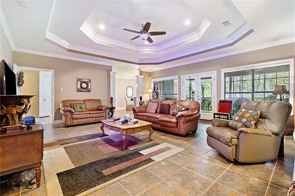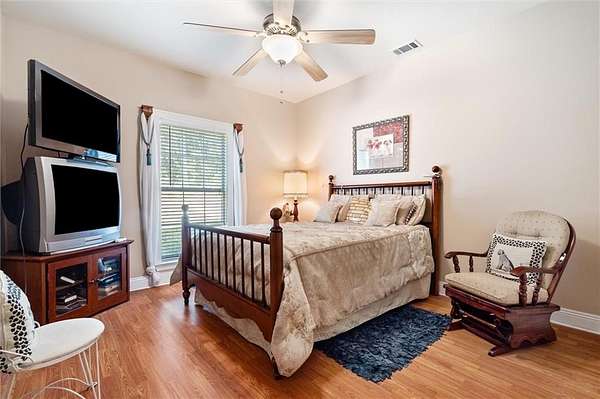 A real hidden treasure on 2.42 acres with over 300 ft. on Hamilton Creek, with bass, brim, catfish and more. The winding driveway invites you to this one-owner, custom built amazing home. Wooded seclusion and privacy await, but just minutes to everything. 4 very spacious bedrooms, 2 full baths and 2 half baths. The primary bedroom with a tray ceiling is 27' by 20' which gives you room for large furniture plus a seating area. Added amenities are 2 large walk-in closets, 2 separate vanities, one with a dressing table, jetted tub and separate shower, and a separate water closet. Other bedrooms are spacious and boast their own walk-in closets. Large foyer invites you into a very open plan with a great flow. Large dining room, breakfast bar, breakfast room all make entertaining easy. kitchen and all 4 bathrooms have granite counters, a walk-in corner pantry, lots of cabinets, a double oven and so much more. Crown molding, chair rail, blinds and window treatments stay with the home. The oversized family room with double octagonal tray ceiling overlooks the large, screened porch with surround sound. The screened porch faces a separate patio that is adorned by magnolias, satsumas, navel oranges, kumquats, lemon tree, and other flowering bushes and hardwoods. One of the two ac units is less than a year old, and the other is 5 years old. All furnishings can stay or be removed. Transferable termite bond. All bricked and trimmed in concrete hardiboard to resist wear. Buyer responsible for verifying all measurements and relevant details.