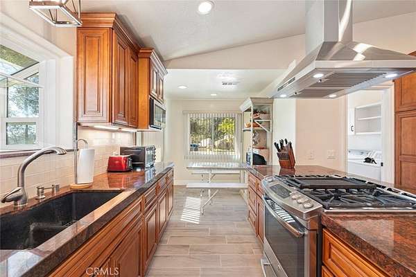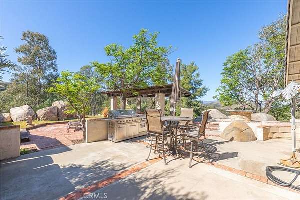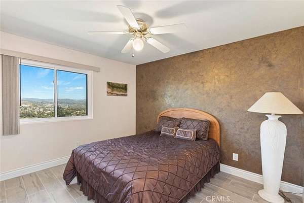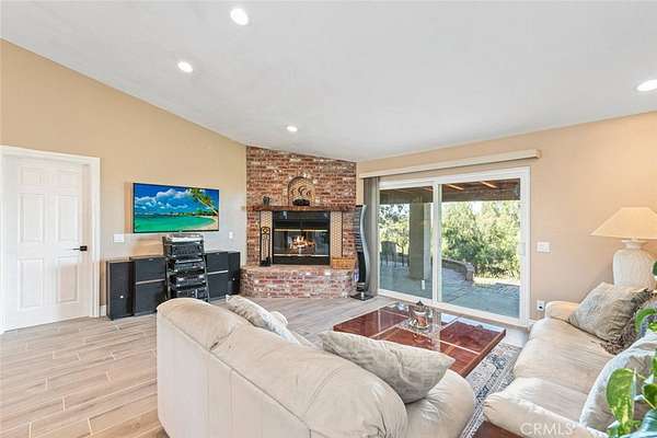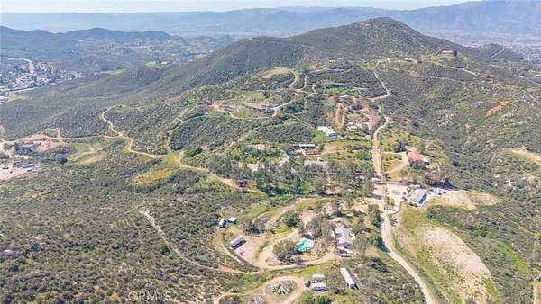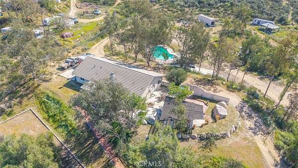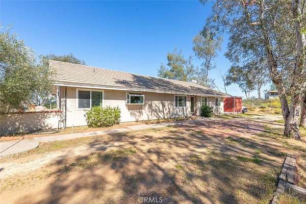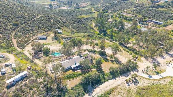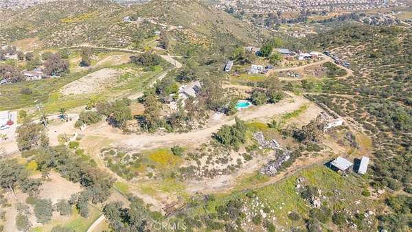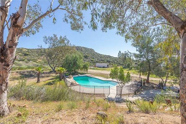 Welcome home to this stunning single-story ranch-style POOL home featuring 3 bedrooms plus an office/den (easily converted to a 4th bedroom), 2 full bathrooms, and located on an incredible 6.46 acres which are usable and secluded. This property has with LOW TAXES and NO HOA. Offering breathtaking 180-DEGREE PANORAMIC VALLEY VIEWS that provides the perfect balance of privacy, space, and convenience—ideal for RVs, toys, horses, or future expansion. Inside, the home showcases gorgeous porcelain tile flooring throughout, new baseboards, all new door casings, new interior and exterior doors and a thoughtfully designed layout that includes a formal living room, formal dining area, and an impressive chef’s kitchen. The kitchen features custom built-in cabinetry, granite countertops, bar seating, a cooktop with vented hood, stainless steel appliances, decorative tile backsplash, wine cooler, and a charming bay-window sitting area perfectly positioned to capture the sweeping views. The spacious family room offers vaulted ceilings, a cozy fireplace, and abundant natural light, creating an inviting space for everyday living and entertaining. Recent upgrades include newer vinyl windows and sliding doors throughout, along with a new AC system. The primary suite is large and private, featuring vaulted ceilings, a walk-in closet, sliding door access to the outdoors, and a beautifully updated bathroom with a custom walk-in shower. Two additional bedrooms are generous in size and share a remodeled hallway bathroom with dual sinks, a tub/shower combo, and ample storage. Additional highlights include a large indoor laundry room with cabinetry and potential exterior access, making it ideal as a mudroom. Outdoors, enjoy multiple patio areas, a fire pit for crisp evenings, and endless opportunities to relax while taking in the expansive valley views. The property offers miles of scenic riding trails, extensive usable land suitable for an equestrian setup or boarding facility, and most of the acreage is fenced. An additional graded pad outside the fenced area provides an excellent opportunity for a future ADU. Located close to shopping, businesses, schools, restaurants, and the 15 & 215 freeways, this property offers the rare combination of being near everything while still feeling far removed from the hustle and bustle of city life. This is truly country living at its finest—don’t miss this exceptional opportunity.