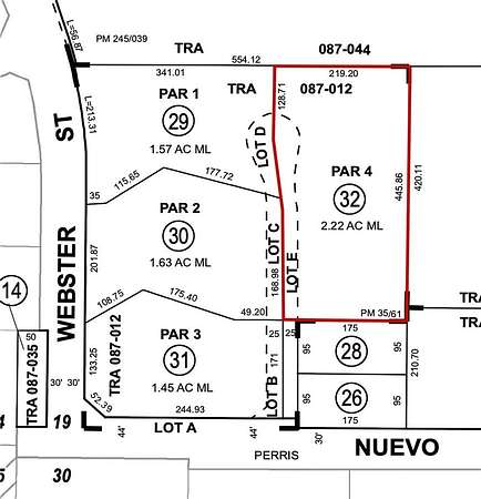 One of three contiguous parcels sold together or separately, this 2.22 acre parcel is on Nuevo Rd. just east of Webster Ave. and in an OPPORTUNITY ZONE 1/2 mile from the I-215 interchange which ALLOWS 60 UNITS PER ACRE! WATCH aerial video! This is a timely opportunity for an investor or developer to acquire land with Mixed-Use Zoning, bordering Perris, close to the I-215/CA-74 Freeways and Nuevo Road interchange with NO Mello Roos taxes and is exempt from capital gains taxes if held over 10 years. With water and power next door and sewer in the street in front of the 2nd neighboring parcel, this property is ripe for development. We are just down the street from Perris Plaza with Walmart, ALDI, Stater Bros, In-N-Out, Chick-Fil-A, Ross, Starbucks, Planet Fitness and so many other neighborhood amenities that make this area perfect for future residents and future growth. Permitted uses include residential, parks, restaurants, retail, medical offices, and professional services. With conditional approval, additional uses may include hotels, entertainment venues, convenience stores, mobile home parks, and more. Please see OM for a full list of permitted uses. The population of Perris across the street is increasing, income per capita is increasing, poverty is decreasing, and the number of employed persons is also increasing! The other two contiguous parcels that are being sold are 305-270-030 and 305-270-031.