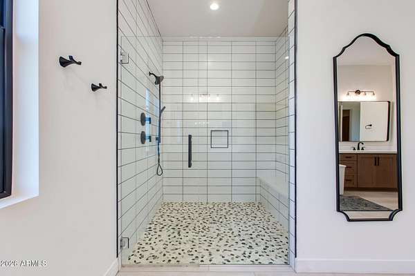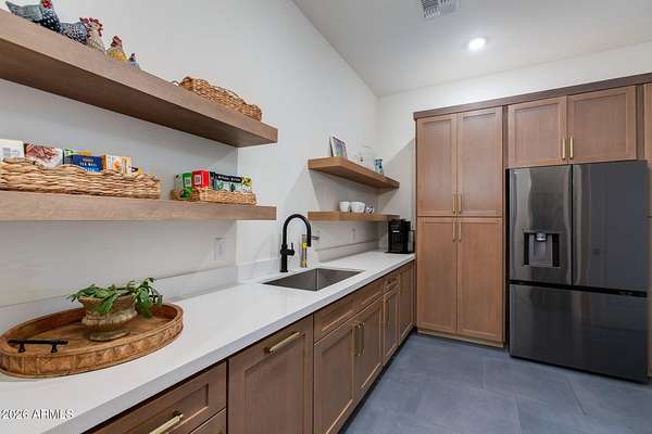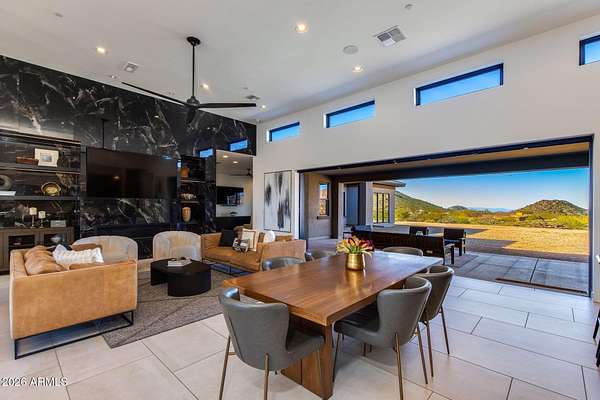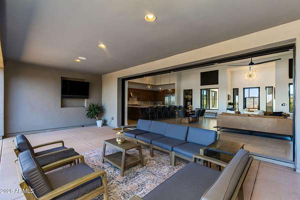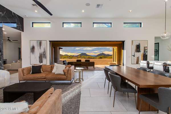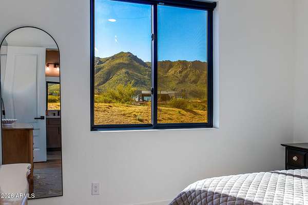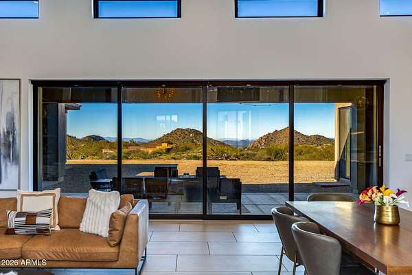 Experience the pinnacle of resort-style living in North Scottsdale's prestigious, guard-gated Sereno Canyon community. Positioned high above neighboring residences, this exceptional 3.7-acre premier homesite offers rare privacy and sweeping, unobstructed views through the natural valley between the McDowell Mountains and Troon Mountain-capturing breathtaking panoramas and unforgettable sunsets. A striking glass-and-iron front door opens to a light-filled great room with full-wall sliding glass doors that seamlessly connect indoor and outdoor living. Ideal for both everyday living and entertaining, the space flows into an oversized chef's kitchen featuring abundant custom cabinetry, expansive counter space, a 48'' gas range with double ovens, and a built-in stainless steel refrigerator. A private office sits just off the great room, while a formal dining room is enhanced by a temperature-controlled wine room that stores 300+ bottles. The desirable split floor plan offers exceptional privacy featuring a total of 6 bedrooms, all ensuite (including the casita) and 6 bathrooms and two half bathrooms. The primary bedroom is split with a luxurious primary retreat featuring dual vanities, soaking tub, expansive tiled shower, dedicated makeup area, and a generous walk-in closet with its own washer and dryer. The opposite wing includes a versatile flex space ( it's own stackable laundry closet) and additional ensuite bedrooms, all with walk-in closets, including a fourth ensuite ideal as a secondary primary. A private guest casita with kitchenette, living area, bedroom, bath, and walk-in closet with washer and dryer completes this remarkable estate. Completing this exceptional offering is immediate access to the Tom's Thumb Trailhead just beyond the backyard, along with walkable proximity to the exclusive Sereno Canyon Mountain House Lodge. Residents enjoy refined dining at Alterra, resort-style pool and spa amenities, and a fully equipped fitness center, all framed by the dramatic mountain landscape. Beyond the gates, North Scottsdale presents an array of upscale shopping, acclaimed restaurants, championship golf, and endless outdoor recreation. This is a rare opportunity to experience a sophisticated desert lifestyle where privacy, luxury, and natural beauty converge.