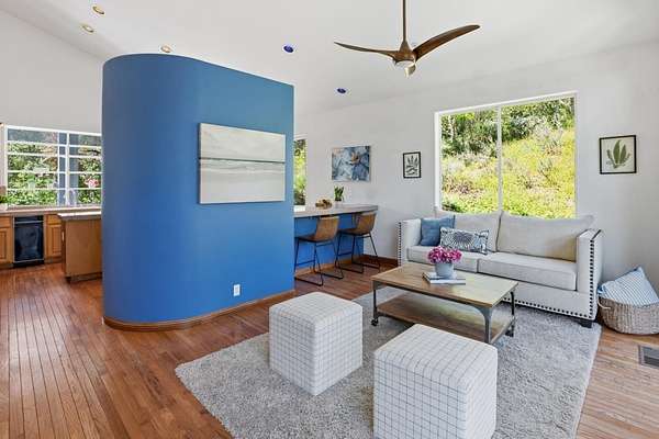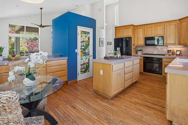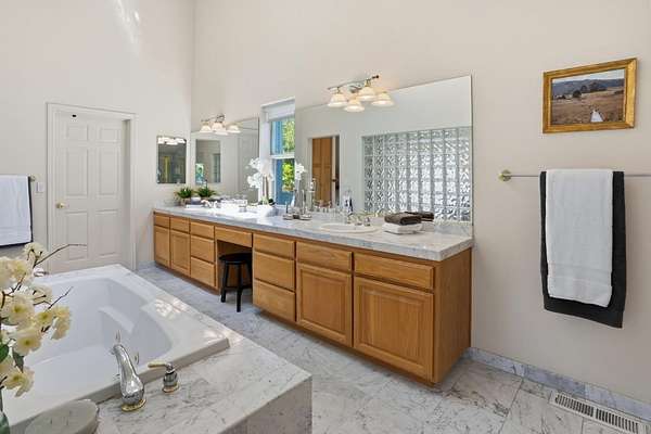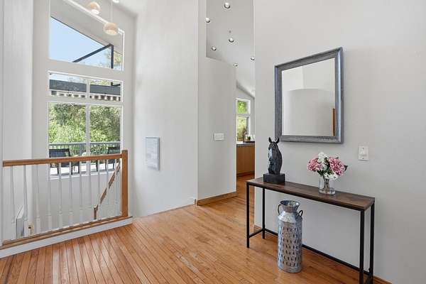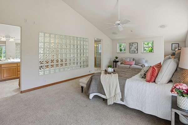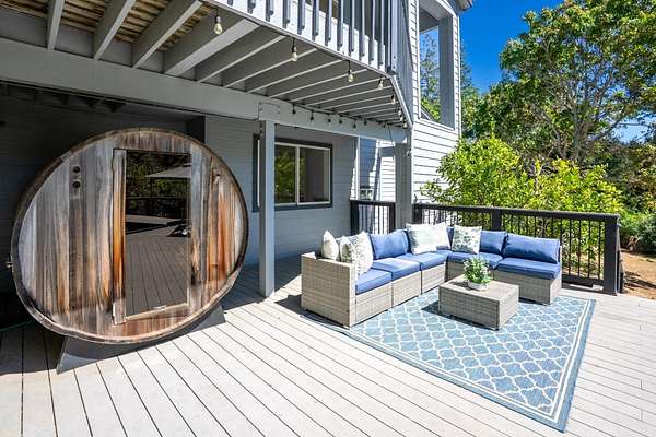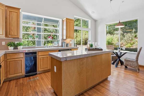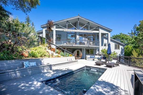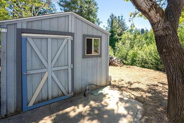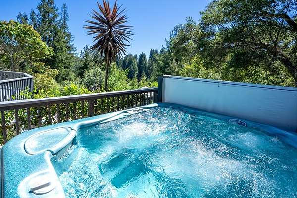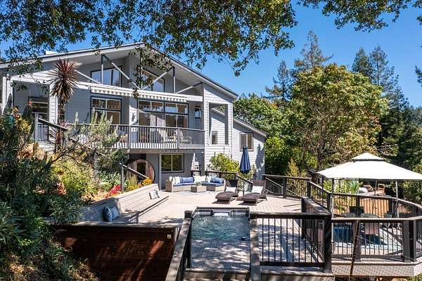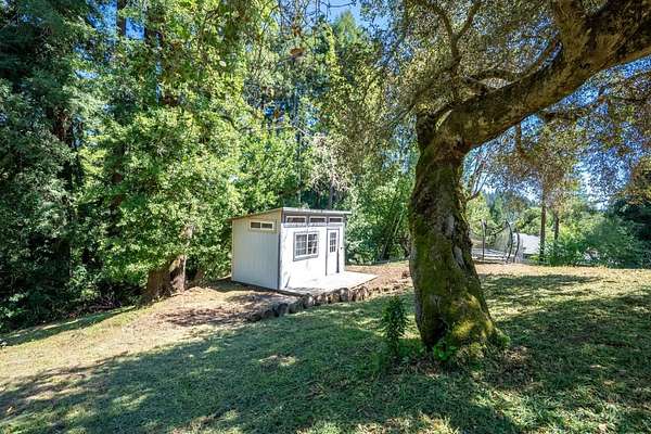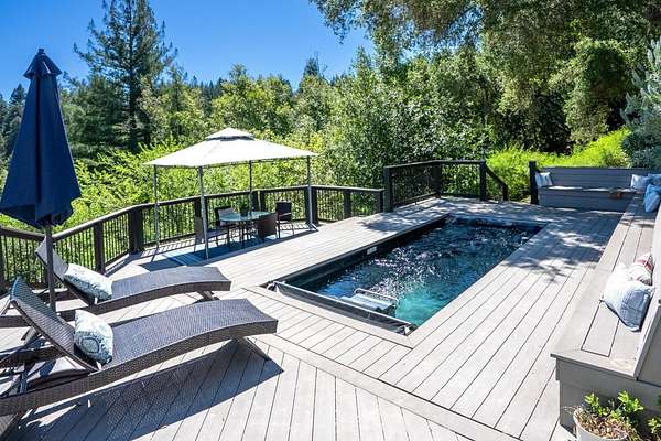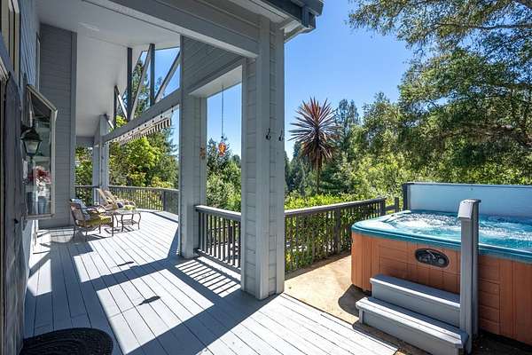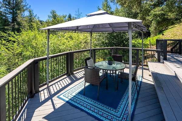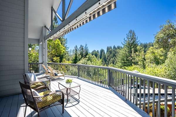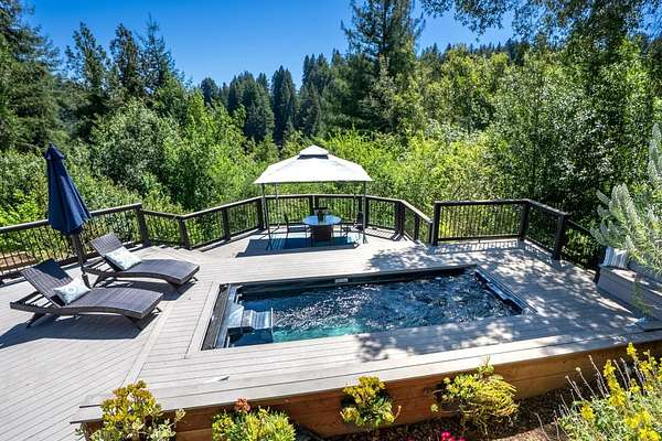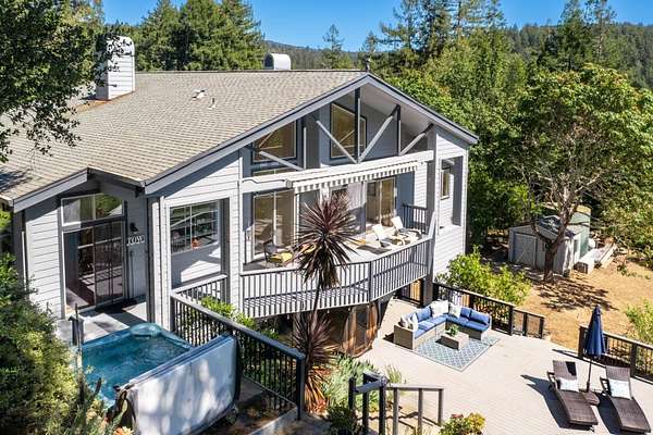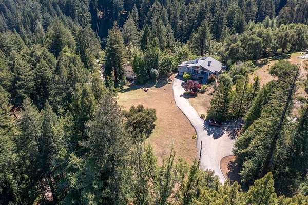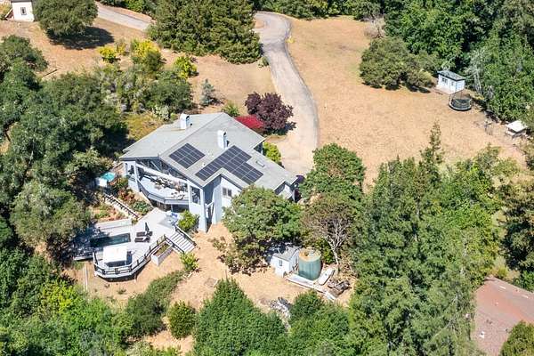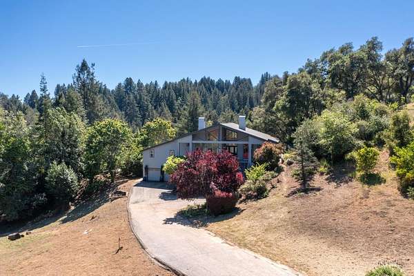 Contemporary mountain home with dramatic high ceilings, walls of windows, serene mountain & meadow views! Sunny usable acreage with colorful drought-resistant landscaping, grassy meadows, and magical redwood fairy rings! An abundance of space to add an ADU, horses, sport court, vineyard, or orchards. The 2-story home is an inverted floorplan with formal entry on the 2nd floor, featuring soaring ceilings and huge artsy chandeliers. Kitchen with granite tile counters, breakfast dining area, walk-in pantry. Formal living room with gas log fireplace, sliders to the front deck with meadow views. Separate family room with woodburning stove. Formal dining room. Kitchen and dining rooms both open to the sunny back deck with automatic awning, and hot tub. Steps down to an Endless Pools swim spa & sauna. The huge primary suite retreat features two 2-story high walk-in closets, spacious ensuite bathroom with oversized jetted tub, stall shower, and dual vanity, marble tile throughout. The lower level comprises two further beds & full bath, utility room, laundry/mud room, and access to the 2 car attached garage. Quality built in 1996 (post-earthquake) to more stringent engineering codes. New (owned) solar, powerwalls, & auto generator. Pool/garden shed, art studio/she-shed, and chicken coop.