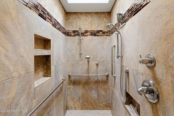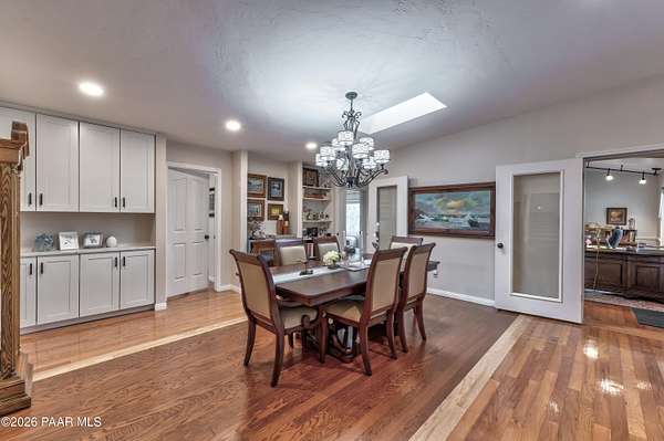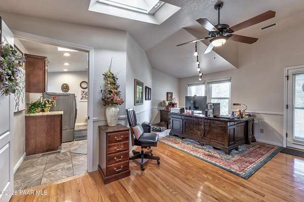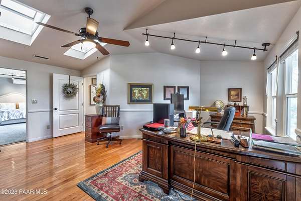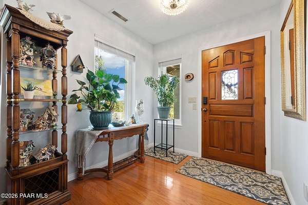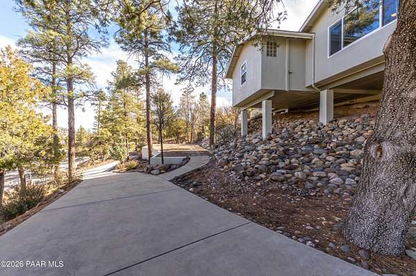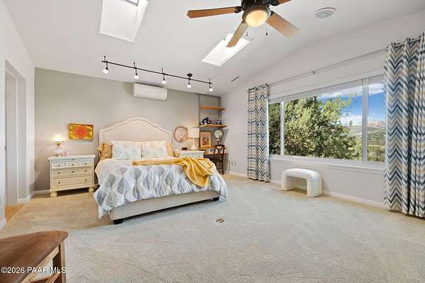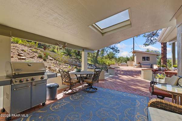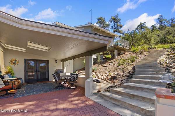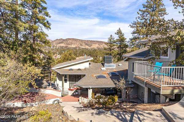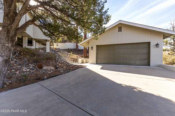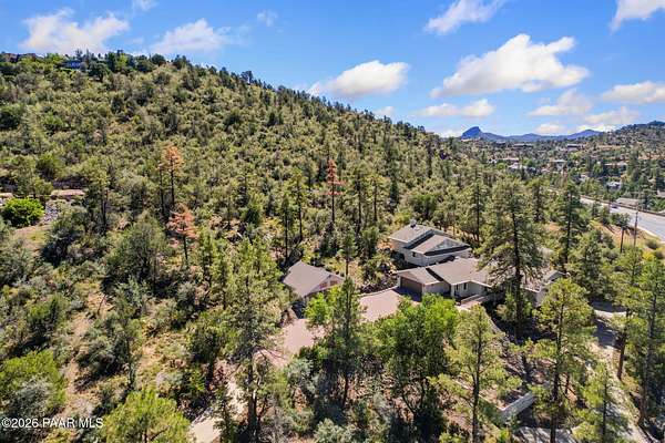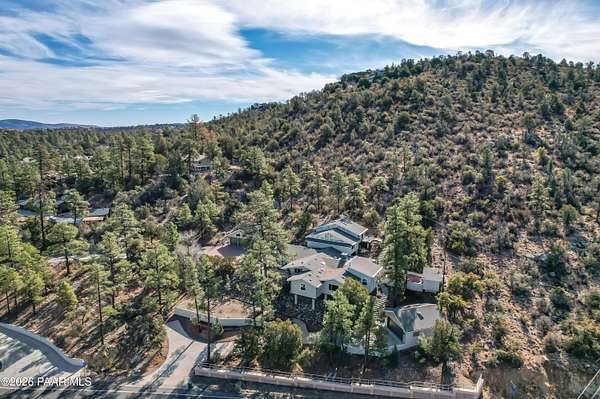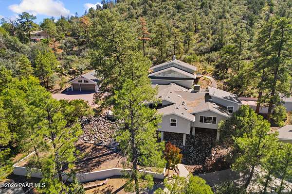 Welcome to this beautifully remodeled Prescott estate on over 2 acres with panoramic views! Offering 4,755 sq ft, this 4-bedroom home features an office with its own separate exterior entrance and a flex/5th bedroom option. Enjoy living on the main level, while the upstairs is perfect for guests or extended family. The spacious eat-in kitchen and 3.5 updated baths complement the open, light-filled layout. Car enthusiasts will love the 3 garages with space for up to 7 vehicles, plus a large driveway offering ample additional parking, along with a workshop and shed. Just 3.5 miles from downtown with no HOA! Enjoy peace and quiet with extra-insulating window glass. This is your ideal place to call home!