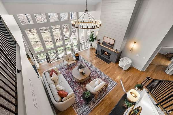 An impressive marble entry opens to soaring ceilings and three stories of floor-to-ceiling windows, creating a dramatic first impression while framing serene views of the manicured lawn, mature trees, patio, and picturesque backyard pond. The home lives with an incredible sense of openness and light, offering sweeping sightlines from the third floor all the way to the walk-out lower level. Walls of windows and soaring ceilings create a breathtaking, airy atmosphere where every level feels connected and immersed in the surrounding natural beauty.