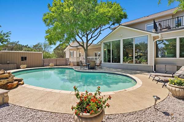 Fabulous New Listing on Mormon Mill Road! Enjoy the perfect blend of convenience and country living on this 1+acre property just minutes from H-E-B, schools, churches, and more. Nestled in a peaceful Hill Country setting, this beautifully maintained home features striking curb appeal with a circular drive and natural landscaping. Inside, the 2,690 SF layout offers 4 bedrooms, 2 living areas, an office, and a fully renovated main level with a modern farmhouse vibe. Step outside to your own private retreat--complete with a sparkling pool and waterfall, raised garden beds, and a fenced area for pets or plants. In addition to the attached garage with built-ins, you'll love the fully insulated metal building with a roll-up garage door--which currently houses a second office, studio, workshop, and home gym. A separate garden shed offers even more storage space. This property truly has it all--comfort, style, and space to spread out--while keeping you close to everything Marble Falls has to offer.