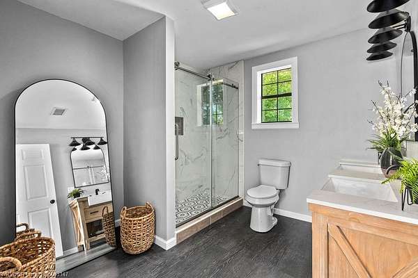 The kitchen features solid-surface countertops, custom locally built cabinetry, new appliances (including an oven with air fryer function), and a clever hidden microwave tucked behind a custom cabinet door. A large island provides extra seating and workspace. Both bathrooms have been fully updated with designer fixtures, custom cabinets, and elegant tilework. Each bedroom includes high-end ceiling fans and generous closets, and the bonus room offers versatility as an extra bedroom, office, playroom, or guest space.