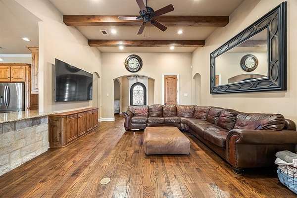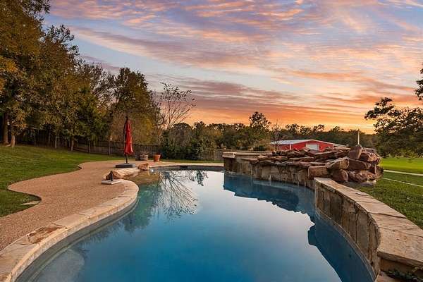 Nearly 5 acres of one-of-a-kind Texas living. This custom-built estate offers luxury with a country flair, delivering the perfect blend of privacy, space, and relaxation. From the front door to the creek's edge, no detail is spared. Inside, the home features four bedrooms and three-and-a-half bathrooms with a thoughtful, functional floor plan designed for everyday comfort and upscale living. Quality craftsmanship, inviting living spaces, and large windows capture scenic views from every angle. Step outside to your personal retreat. Mature shade trees frame wide-open skies, offering a picturesque backdrop for sunrise coffee or sunset gatherings. The gently sloping lawn leads down to a peaceful, tree-lined waterway with a private dock where fishing, paddling, or simply enjoying the serenity becomes part of your daily routine. 2,400 sq ft shop building, fully spray-foam insulated with a full bathroom. With unmatched outdoor living, luxury accommodations, and top-rated Midlothian ISD. Pool, spa, creek, acreage, privacy, this property has it all. 241 Masters Lane is truly one of one