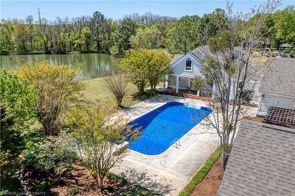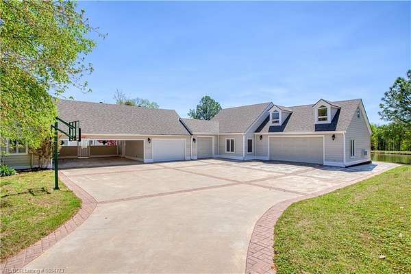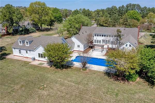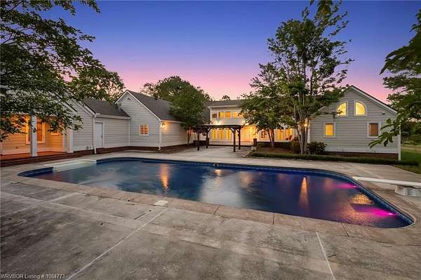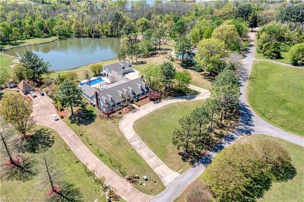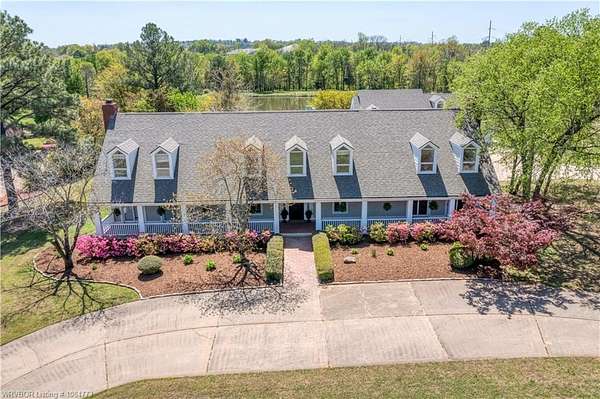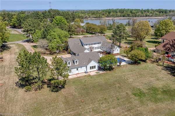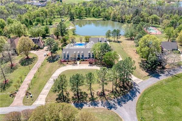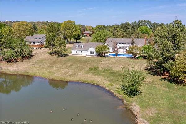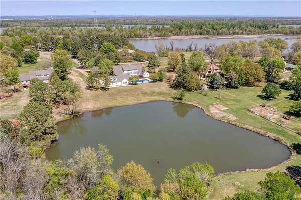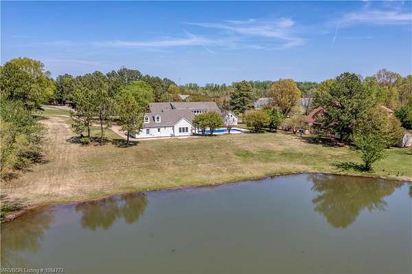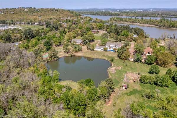 Timeless estate on nearly 5 acres in the gated Wyndermere subdivision. Main home features cathedral ceilings, exposed beams, and fireplaces in both the living room and den. Home is filled with natural light and hardwoods throughout. The spacious kitchen offers granite countertops, custom cabinetry, under cabinet lighting, a large island with pendant lighting, double ovens, and is overlooking the den. The main-level primary suite includes a sitting area, private patio access, dual vanities, dual walk-in closets, a walk-in shower, and a whirlpool tub. Half bath and oversized laundry room with sink on main level. Upstairs offers four additional bedrooms, two Jack-and-Jill baths, and a lounge area. Guest house(600sqft) with bedroom, full bath, kitchenette, & oversized 2-car garage(763sqft). Bonus room over garage(265sqft). Outdoor amenities include a circular front drive, sprawling covered front porch, 3-car attached carport, 2-car garage, inground diving pool (new liner/pool lights in 2023), a stocked pond, mature landscaping, fig trees, new roof (2022), full-yard irrigation, and boat ramp on the Arkansas River. Large patio for entertaining around the pool. Tankless water heaters in main home and guest house for energy efficiency. Security, Space, and Privacy all in one! Located just minutes from Fort Smith's Top-Rated Schools, shopping, dining, Starbucks, 2 miles to Mercy Hospital, 5 miles to Arkansas Colleges of Health Education, 5 miles to University of Arkansas Fort Smith. Must see to appreciate all of the special qualities this home has to offer!