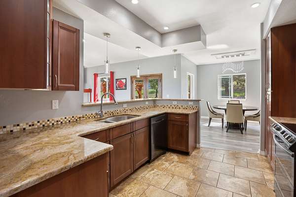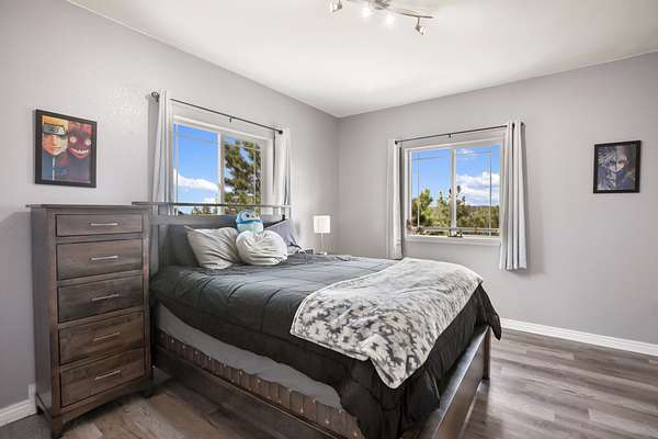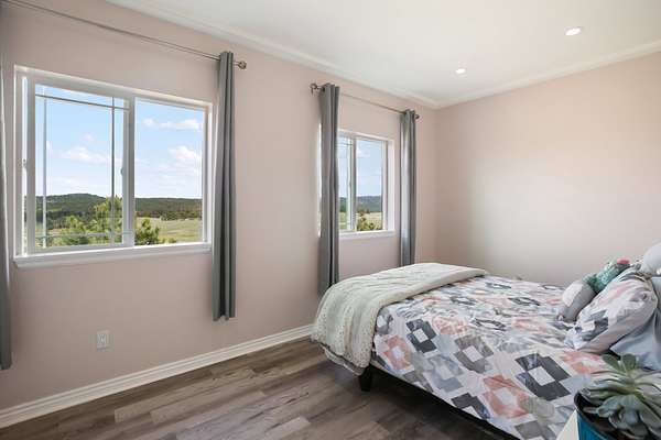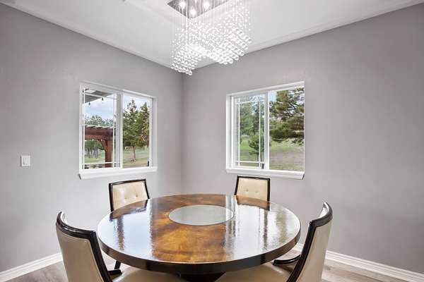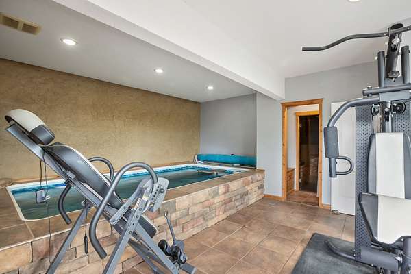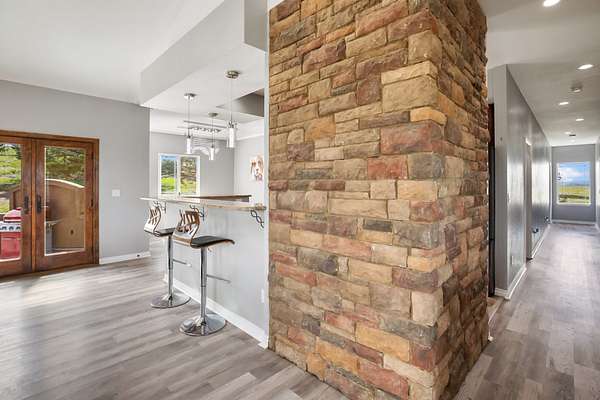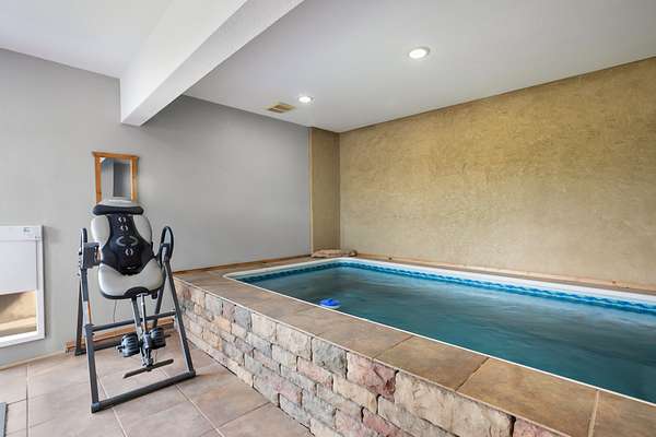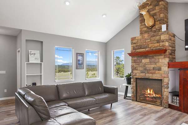 The raised-ranch home features an open-concept layout with 9' ceilings and breathtaking views from every room. With 2,706 sq ft of living space, it includes 4 spacious bedrooms and 3 bathrooms upstairs, including two ensuites--one with a soaking tub in the primary bath. Heated floors throughout the main level ensure year-round comfort and energy efficiency. The great room features a cozy gas fireplace with direct views of Pikes Peak, while the gourmet kitchen boasts cherry cabinets, granite countertops, and modern appliances. The lower level adds 1,600 sq ft, including a 3-car garage, workshop, hobby area, and a spa room with an endless pool, sauna, and shower.