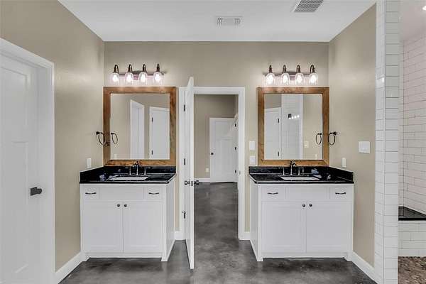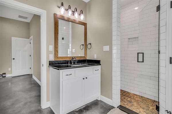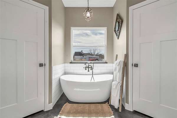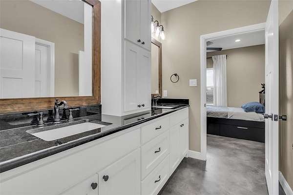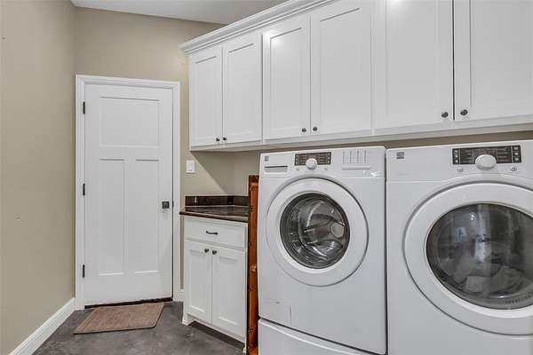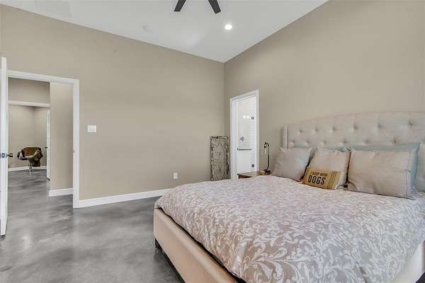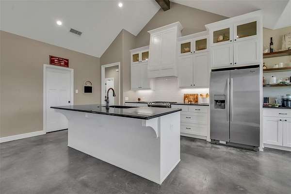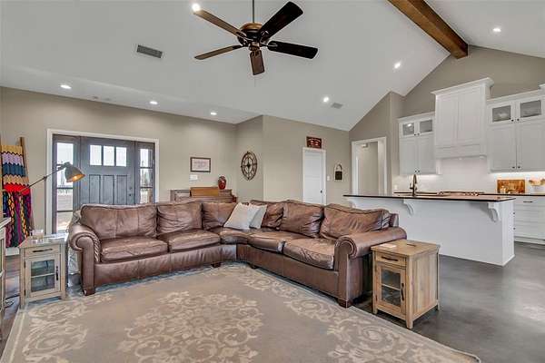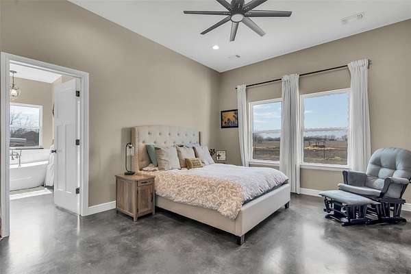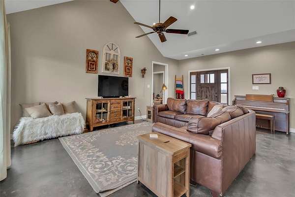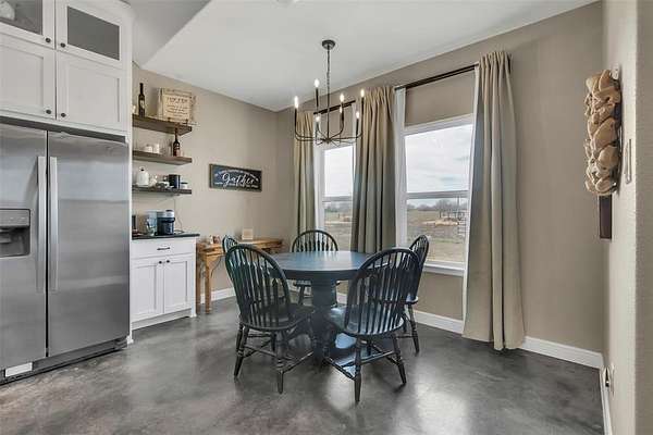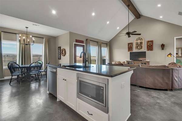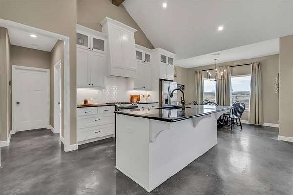 Step inside to a grand entryway that sets the tone for the home’s warm and inviting atmosphere. Sleek stained concrete floors flow throughout, offering both elegance and low-maintenance durability. The open-concept kitchen is filled with natural light from oversized windows, creating the ideal setting for entertaining, family gatherings, or quiet mornings overlooking your land. A spacious walk-in pantry and generous laundry room add both convenience and functionality.