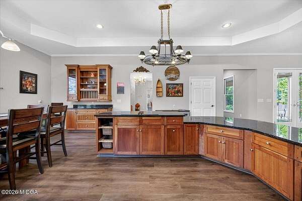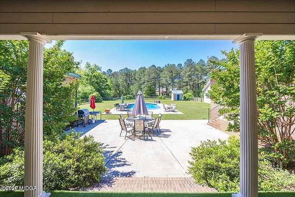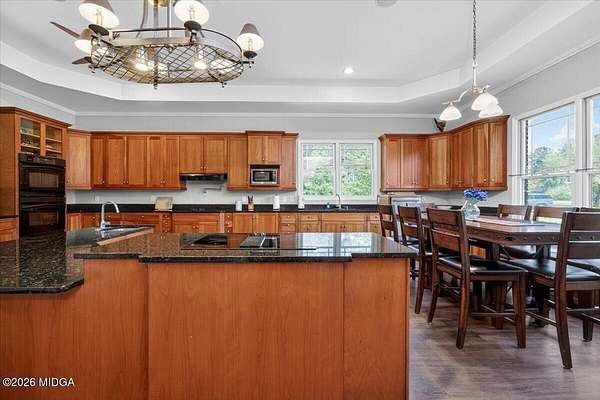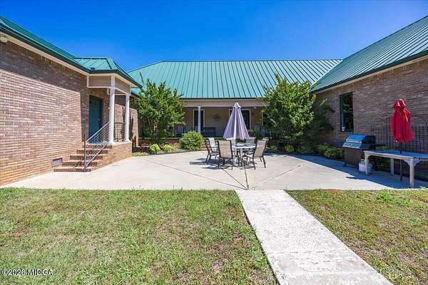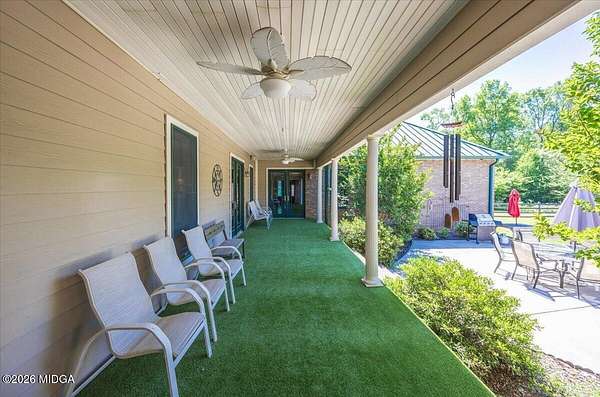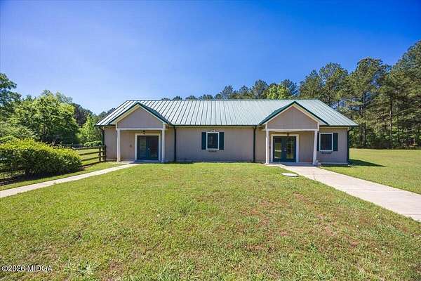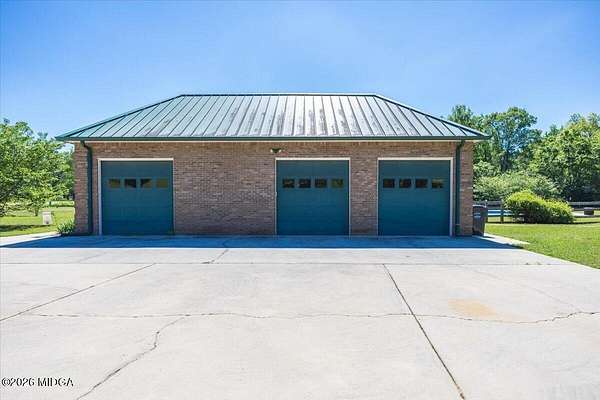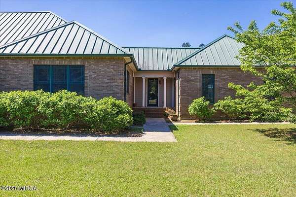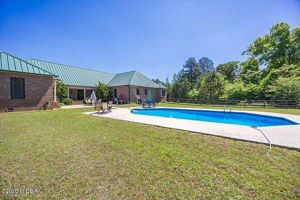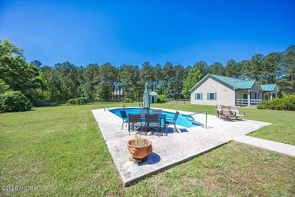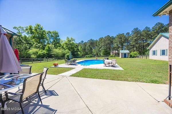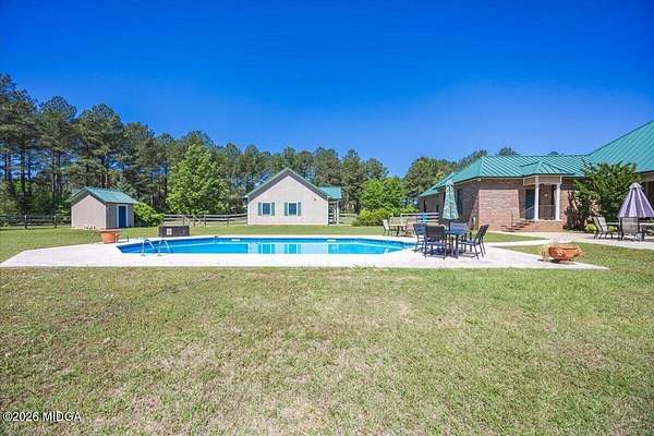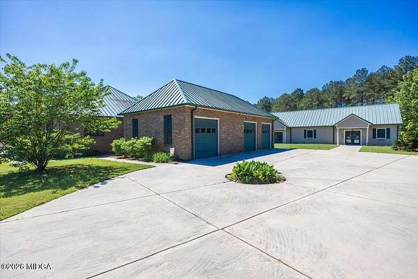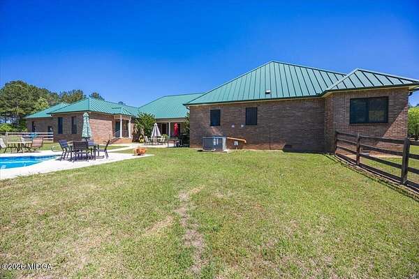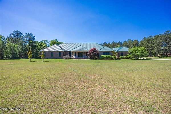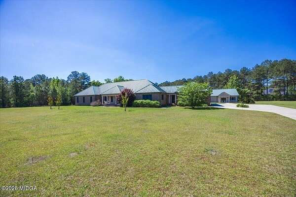 Welcome to a rare opportunity to own a truly exceptional estate in Elko, GA - offering over 5,200 square feet of thoughtfully designed living space on 5+ acres, just minutes from the National Fairgrounds. Built entirely with steel framing for enhanced durability and peace of mind, this all-brick home blends quality construction with functional luxury at every turn. From the moment you arrive, the expansive front porch and grand double-door entry set the tone. Step inside to a stunning foyer featuring custom recessed wall niches, soaring ceilings, and hardwood flooring that flows throughout the main living areas. The heart of the home is an entertainer's dream kitchen - massive in size and design - featuring granite countertops, dual electric cooktops, double convection ovens, a large island, breakfast area, walk-in pantry, butler's pantry, dry bar with wine storage, and beautifully stained cabinetry. Designed for both everyday living and hosting on a large scale. The spacious living room offers tray ceilings, a cozy fireplace, and custom built-in shelving, all flowing seamlessly to the covered back porch - creating an ideal indoor-outdoor living experience. The primary suite is truly a retreat of its own, featuring a private sitting area, an oversized walk-in shower, dual privacy toilets, double vanity, and an expansive wraparound walk-in closet. Each additional bedroom offers direct bathroom access, including a Jack-and-Jill setup with a large walk-in shower and generous closet space. Step outside and you'll find a backyard designed for both relaxation and entertainment--complete with a 9-foot deep saltwater in-ground pool, patio area for gatherings, covered porch, artificial turf accents, and full fencing for privacy. For those needing workspace or additional functionality, the property includes a massive detached workshop equipped with HVAC and water--perfect for hobbies, storage, or business use. Currently operating as a highly successful Airbnb with consistent weekly bookings--especially during Fairgrounds events--this property offers not only a beautiful place to live, but also a proven income-producing opportunity. With its size, layout, and location, there is also potential (subject to approval) for commercial or mixed-use possibilities. This is more than a home - it's a lifestyle, an investment, and a one-of-a-kind property you won't find again.