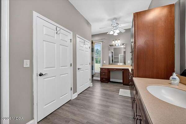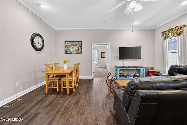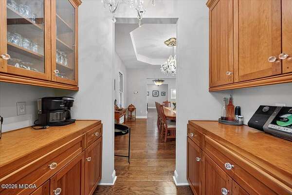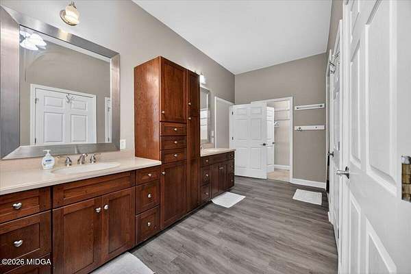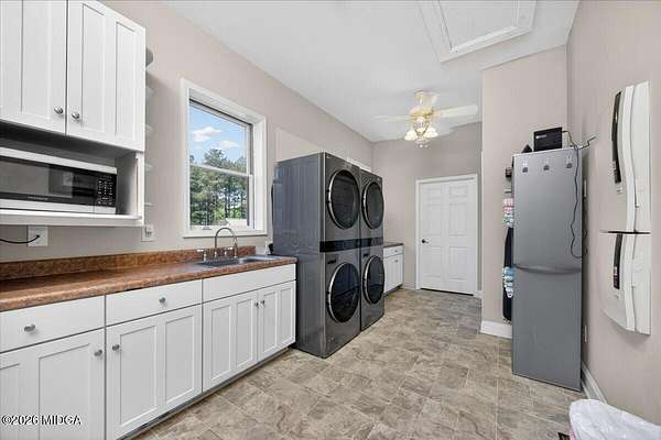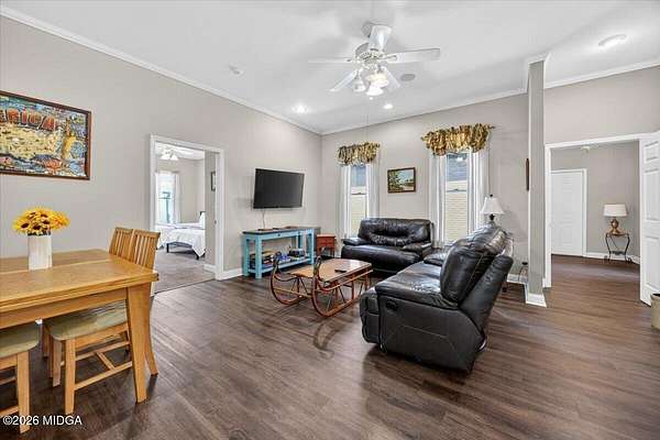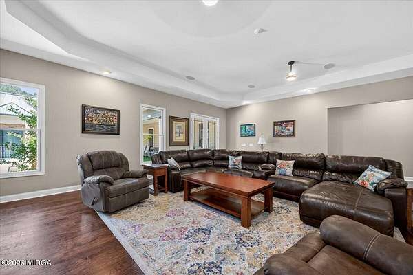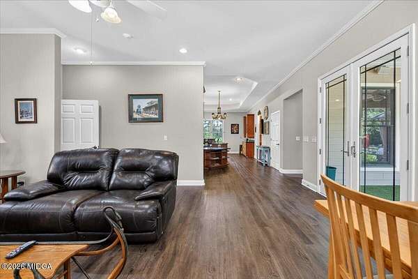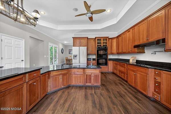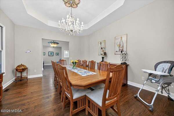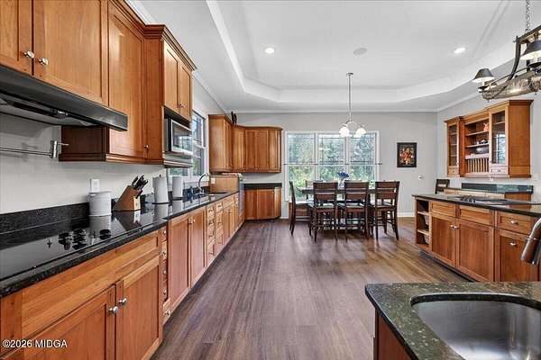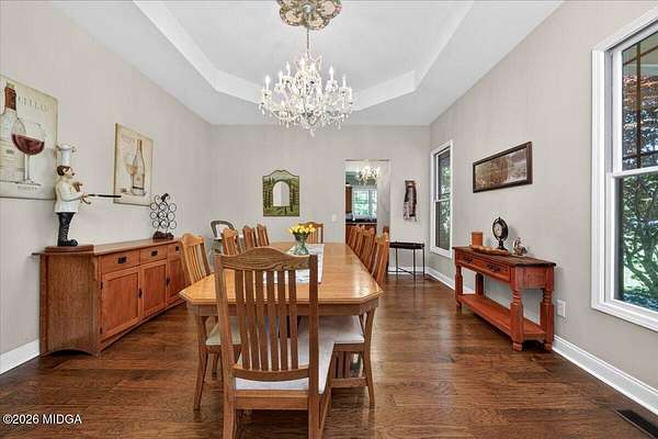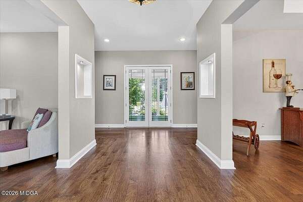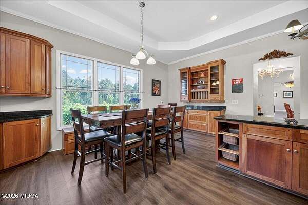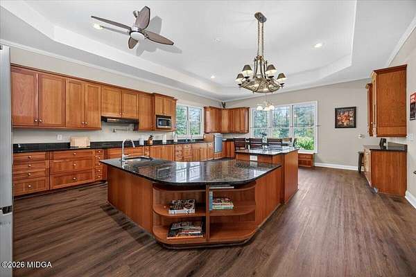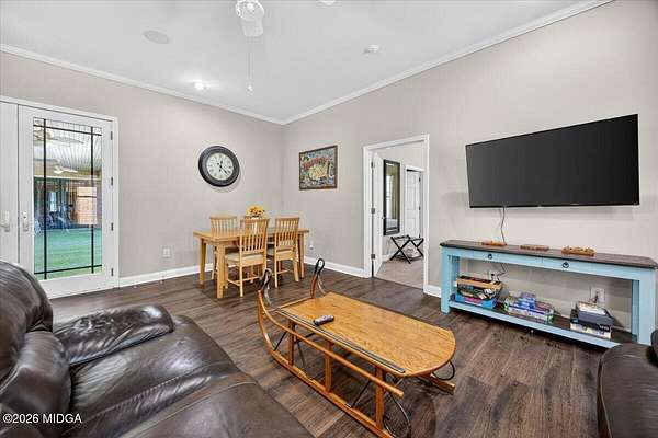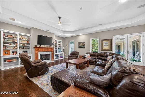 Welcome to a rare opportunity to own a truly exceptional estate in Elko, GA - offering over 5,200 square feet of thoughtfully designed living space on 5+ acres, just minutes from the National Fairgrounds. Built entirely with steel framing for enhanced durability and peace of mind, this all-brick home blends quality construction with functional luxury at every turn. From the moment you arrive, the expansive front porch and grand double-door entry set the tone. Step inside to a stunning foyer featuring custom recessed wall niches, soaring ceilings, and hardwood flooring that flows throughout the main living areas. The heart of the home is an entertainer's dream kitchen - massive in size and design - featuring granite countertops, dual electric cooktops, double convection ovens, a large island, breakfast area, walk-in pantry, butler's pantry, dry bar with wine storage, and beautifully stained cabinetry. Designed for both everyday living and hosting on a large scale. The spacious living room offers tray ceilings, a cozy fireplace, and custom built-in shelving, all flowing seamlessly to the covered back porch - creating an ideal indoor-outdoor living experience. The primary suite is truly a retreat of its own, featuring a private sitting area, an oversized walk-in shower, dual privacy toilets, double vanity, and an expansive wraparound walk-in closet. Each additional bedroom offers direct bathroom access, including a Jack-and-Jill setup with a large walk-in shower and generous closet space. Step outside and you'll find a backyard designed for both relaxation and entertainment--complete with a 9-foot deep saltwater in-ground pool, patio area for gatherings, covered porch, artificial turf accents, and full fencing for privacy. For those needing workspace or additional functionality, the property includes a massive detached workshop equipped with HVAC and water--perfect for hobbies, storage, or business use. Currently operating as a highly successful Airbnb with consistent weekly bookings--especially during Fairgrounds events--this property offers not only a beautiful place to live, but also a proven income-producing opportunity. With its size, layout, and location, there is also potential (subject to approval) for commercial or mixed-use possibilities. This is more than a home - it's a lifestyle, an investment, and a one-of-a-kind property you won't find again.