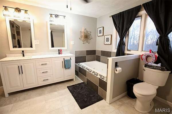 The main-level primary suite was fully remodeled into a spa-inspired retreat with ceramic tile flooring, a tiled walk-in shower, and a jacuzzi tub. New flooring flows throughout the home, including hardwood in the living and dining rooms, LVP in common areas, and new carpeting in the bedrooms.
