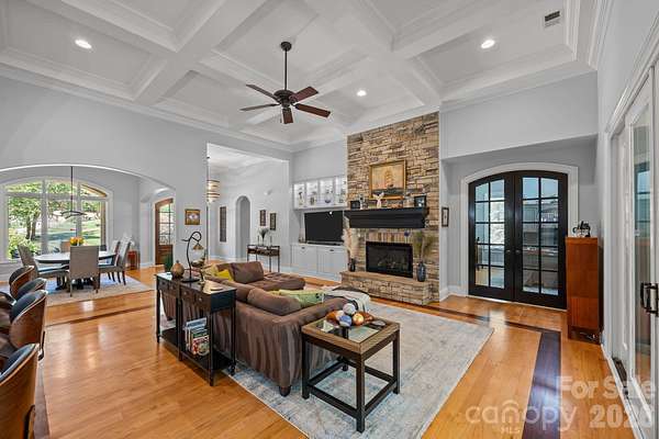 Exceptional Davidson Retreat with over 6,100 sq. ft. of Refined Living including a Heated Pool! Discover timeless craftsmanship and modern luxury in this stunning 5-bedroom home just minutes from Davidson College and Lake Norman. Set on a naturally contoured lot offering privacy and curb appeal, this residence features soaring ceilings, expansive windows, and open living spaces filled with light. The chef's kitchen flows into a spacious great room and covered outdoor living area-perfect for entertaining. The primary suite is a serene retreat with a spa-inspired bath and custom closets. Terraced landscaping and mature trees enhance the property's character, creating a peaceful, elevated setting. Impeccably maintained and move-in ready-every detail reflects quality and care. Washer/dryer set on the basement level will remain, TV Mount does not.