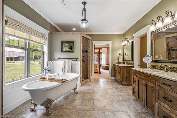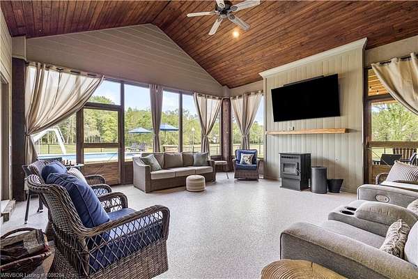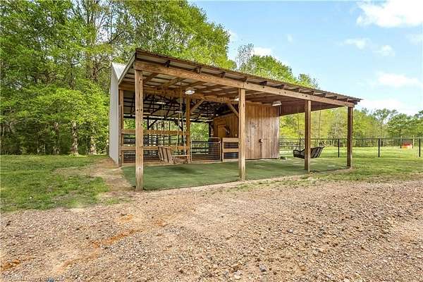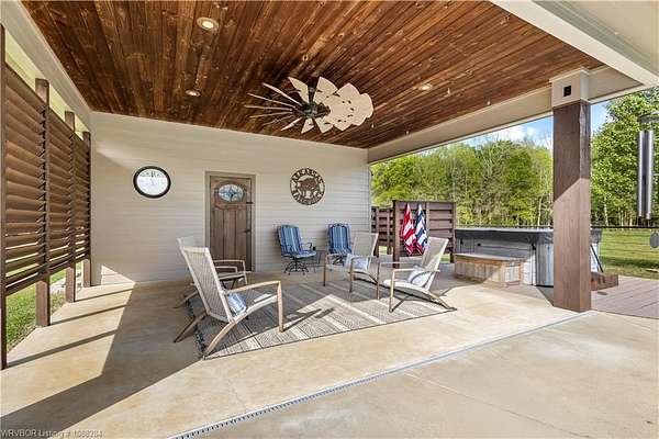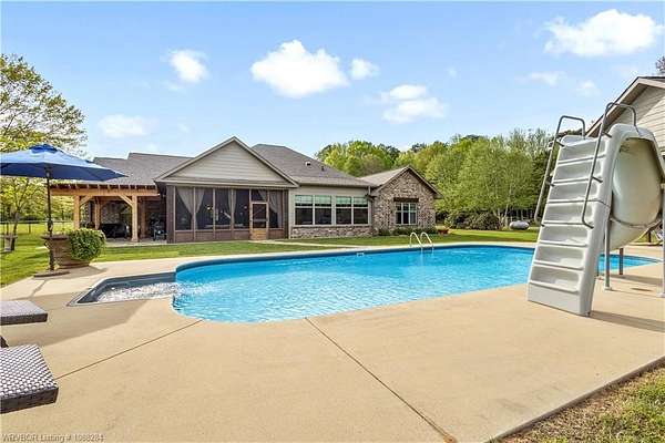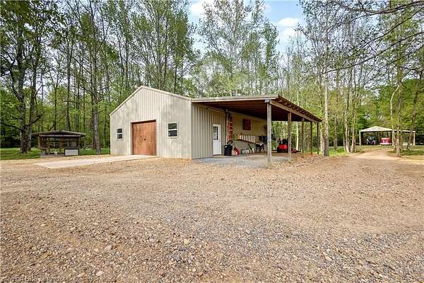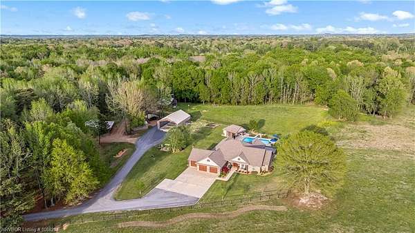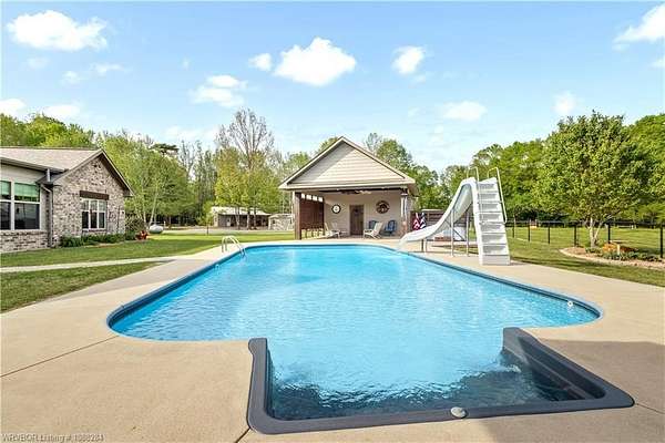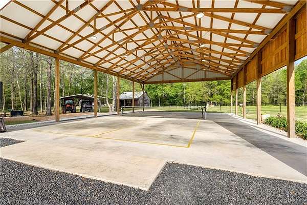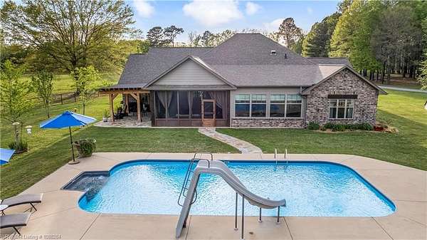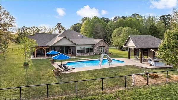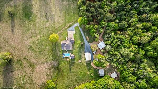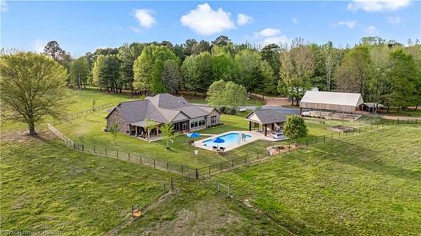 Welcome to a rare opportunity to own a fully equipped country estate that blends luxury living with unmatched functionality on 34.77 acres. This 3,344 sq ft home offers 3 bedrooms, 2.5 baths, plus a dedicated office that can easily serve as a 4th bedroom. Inside, you'll find rich hickory floors, custom cabinetry throughout, detailed crown molding, and a spacious open layout designed for both everyday living and entertaining. The kitchen is built to perform, featuring a commercial-grade gas range with griddle and double convection ovens, built-in refrigerator/freezer, nugget ice maker, trash compactor, and custom hickory cabinets with quartz countertops. A large island with prep sink and seating for six flows seamlessly into the main living space, complete with a custom-built entertainment center. The private primary suite offers a true retreat with an oversized clawfoot tub, large walk-in shower, and a custom walk-in closet with built-ins. The property itself separates from anything else on the market. Enjoy a screened 20x20 porch with pellet stove, TV, and custom vinyl curtains, plus a flagstone patio with covered pergola, gas and electric hookups, and multiple entertaining spaces. The backyard is built for resort-style living with an 18x36 inground pool, cabana with bathroom and outdoor shower, and hot tub-all overlooking your private acreage. Also includes: Covered and lighted pickleball court (also doubles as RV parking with hookups) 30x40 workshop with side shed Hay barn and additional storage structures Stalled barn with wash bay, feed room, fans, and hot/cold water Covered dog kennel with run Additional features include a heated and cooled 3-car garage, whole-home generator system, 3-zone HVAC, central vacuum, recirculating hot water, and irrigation system. With approximately 18 acres of timber and wide-open usable land, this property offers the perfect balance of privacy, recreation, and functionality-all in one place.