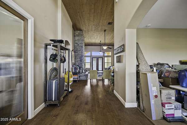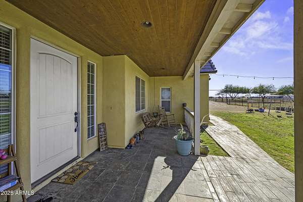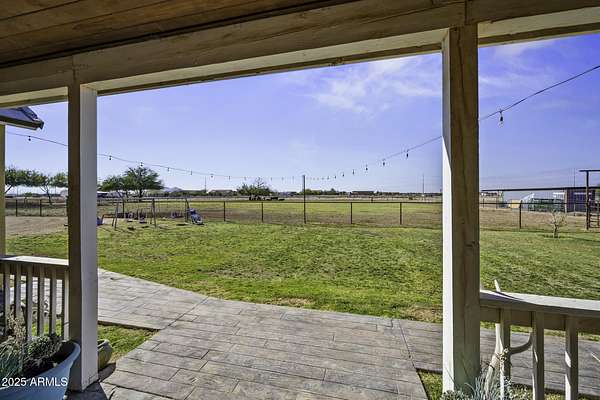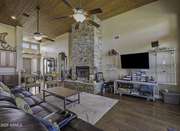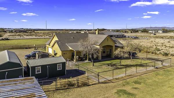 HOME ON IRRIGATED LAND - NO HOA! Build your own food forest and live off the land with this incredible 4.56-acre irrigated property-a rare find with no HOA! Build a family compound! This beautiful country home offers stunning mountain views and endless possibilities. Perfect for a horse property, RV enthusiasts, or a self-sufficient lifestyle, this expansive lot provides ample space for animals, gardening, and more. Two massive shade structures are ideal for livestock, RVs, or trailers. The property also includes plenty of corrals for animals and built-in dog runs. Step inside and be blown away by the 14ft tongue & groove ceilings and the breathtaking floor-to-ceiling rock fireplace in the spacious open floor plan. The chef's kitchen boasts a large island, upgraded cabin surface countertops. Additional custom features include stained interior doors, a wet bar area, and an oversized laundry room. This home also comes with recent upgrades, including a new roof (2022), one new AC (1 of 2) and a new reverse osmosis system (2023). The property features a shared well with 5 lots, 3 of which belong to the seller, and the other 2 are currently vacant. Depending on your vision, you could own up to 3 of those lots! For additional storage or workspace, there are three sheds, two of them with electricity and temperature control. All of which convey. The possibilities are endless! whether you dream of creating a family compound, hobby farm, RV haven, or a thriving food forest. This is your chance to own a unique slice of Arizona paradise!
