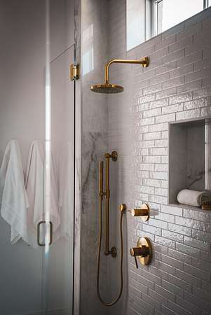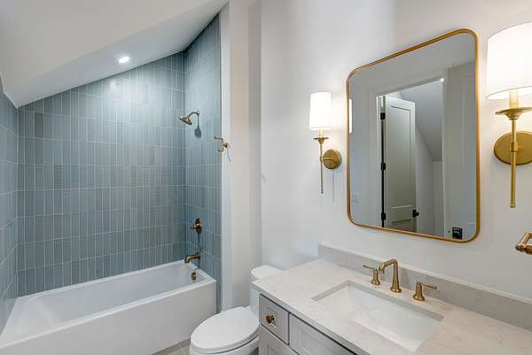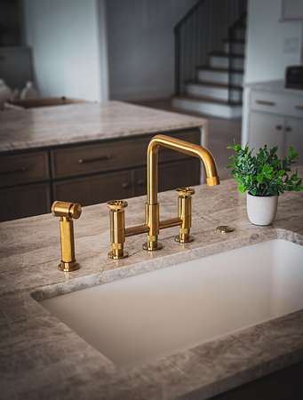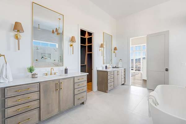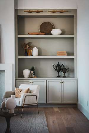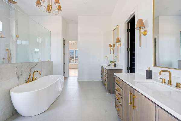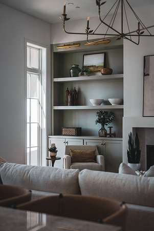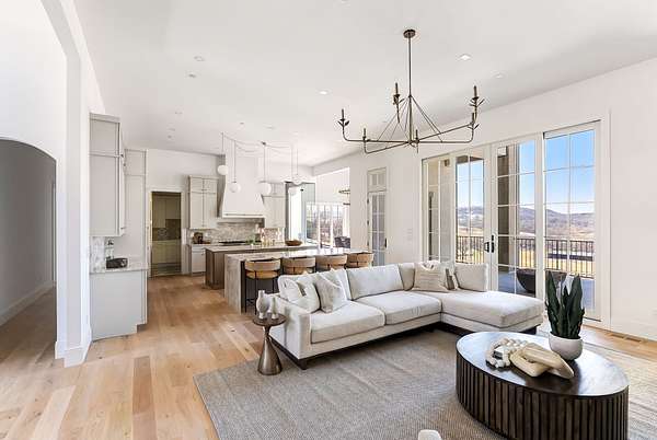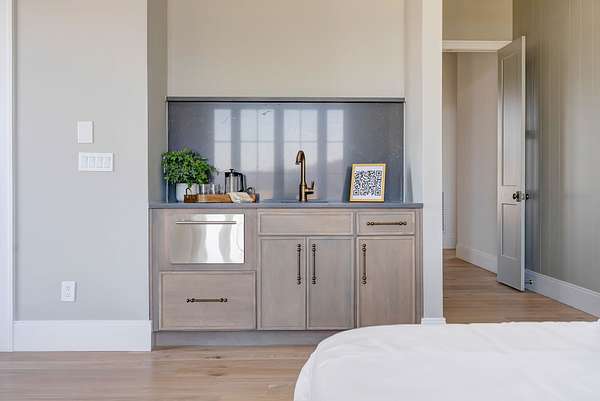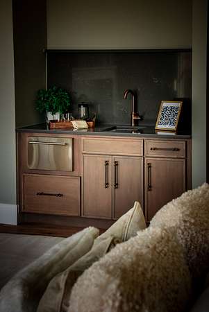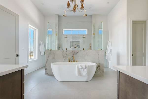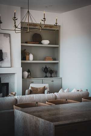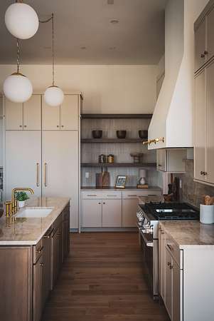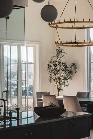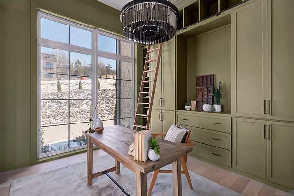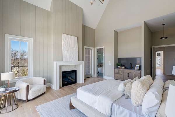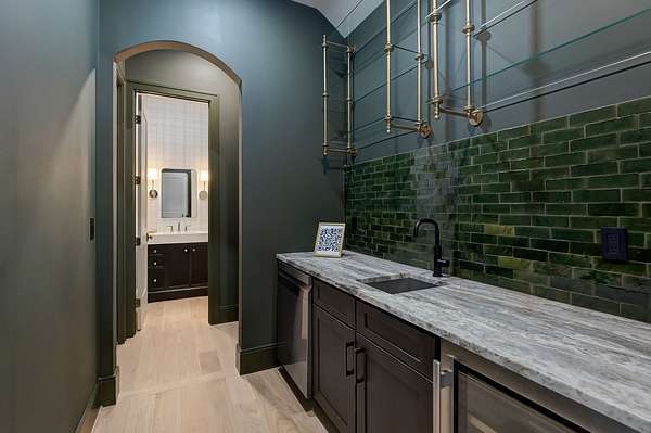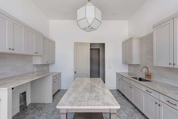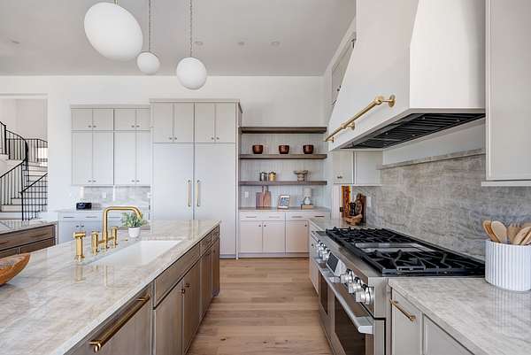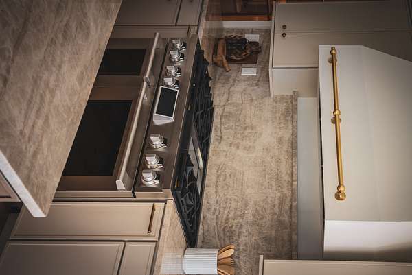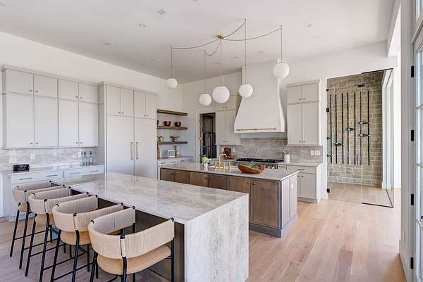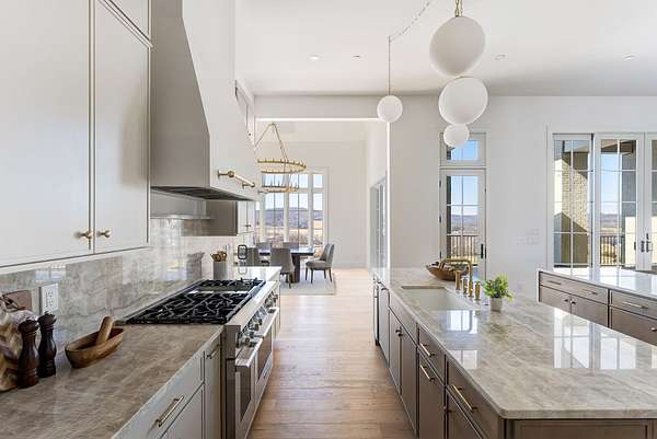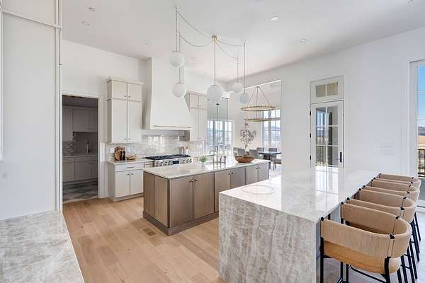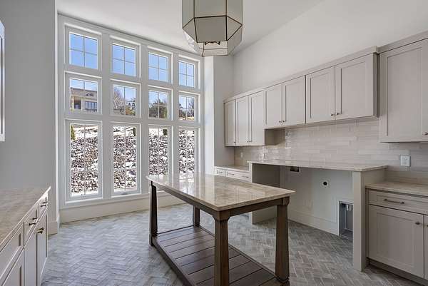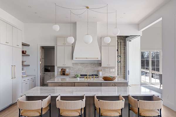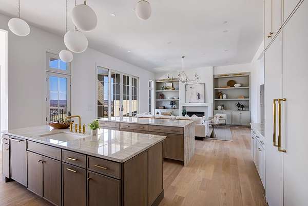 The Tudor-inspired exterior blends natural stone and brick selected to complement the landscape and capture warm sunset views. Inside, the home centers around a chef's kitchen featuring a double-island layout designed for functionality, flow, and gathering. Fully panelized appliances maintain a seamless aesthetic while a full scullery with secondary kitchen allows for effortless entertaining while keeping the main space pristine.