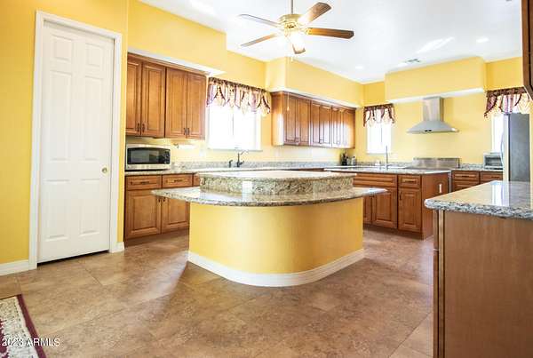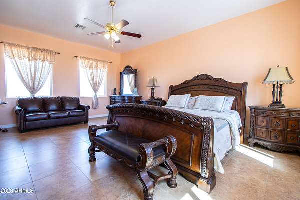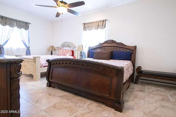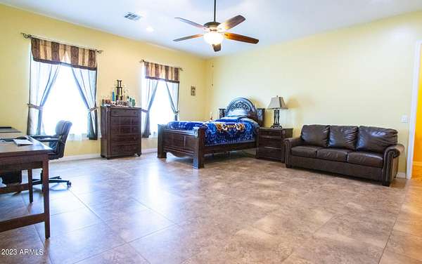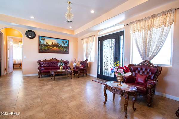 Welcome to your private desert oasis! This stunning custom home sits on a sprawling 5-acre lot with breathtaking mountain views in every direction. As you approach the property, you'll be greeted by a spacious driveway and a charming front porch perfect for enjoying the beautiful desert scenery. Step inside to a grand and spacious open floor plan with high ceilings, tile flooring, and plenty of natural light. The large living room features a stunning domed ceiling and is perfect for relaxing or entertaining guests. The gourmet kitchen is a chef's dream with granite countertops, stainless steel appliances, and a center island with breakfast bar seating. The primary bedroom is a luxurious retreat with a private en-suite bathroom, dual sinks, and 2 large walk-in closets. There are six additional bedrooms, each with it's your own private resort-style backyard complete with a covered patio, built in BBQ and multisport court. Features a well, providing ample water for irrigation and landscaping. Located just minutes from the amenities, this home offers a rare opportunity to own a truly remarkable piece of desert paradise. Paved roads to the home. Don't miss out on this incredible property!