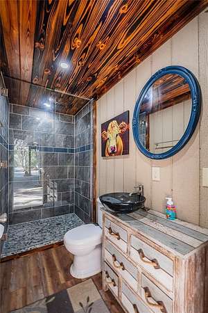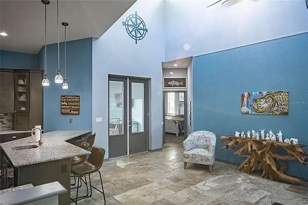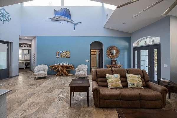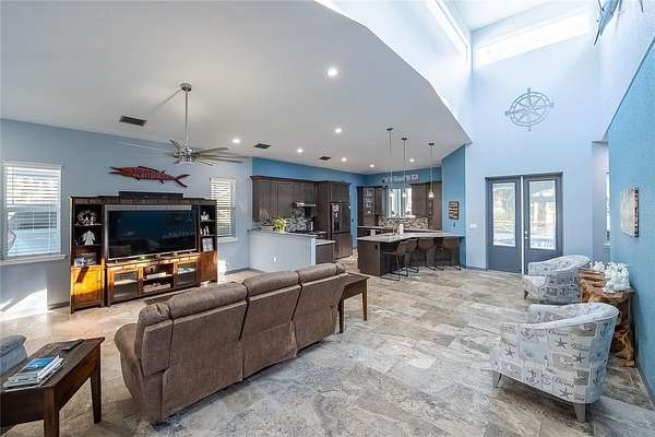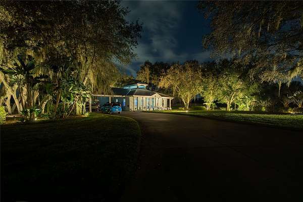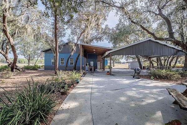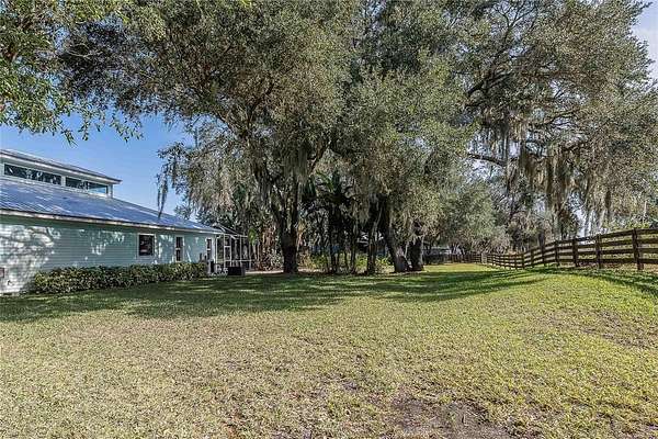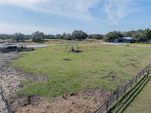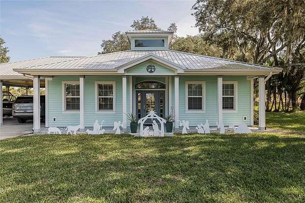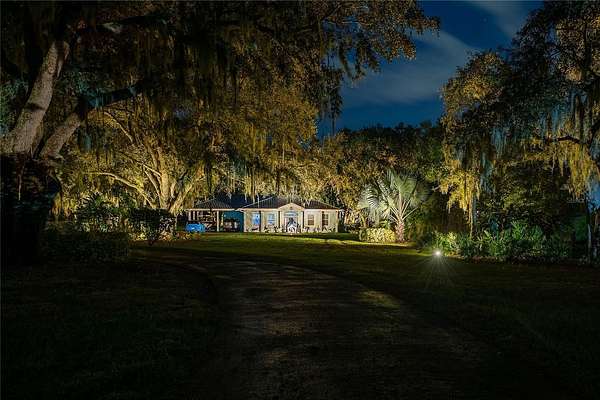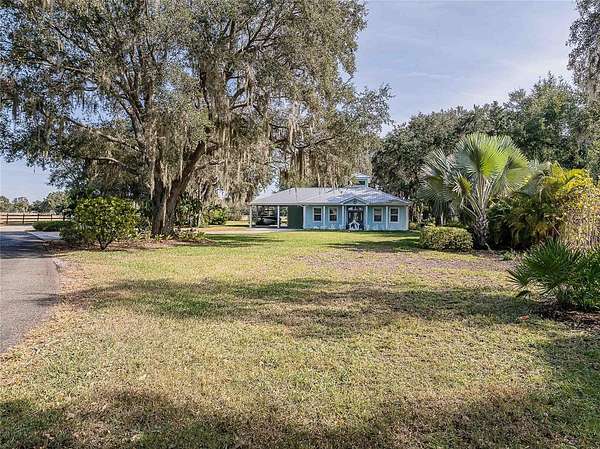 Key West-style home on more than 6 acres with beautifully landscaped grounds and travertine flooring throughout. This one-story layout offers an open floor plan, granite countertops, gas range, walk-in pantry, and extensive cabinet storage. Enhanced with Starlink high-speed internet, offering dependable modern connectivity for venue use, remote work, or ranch operations. Enjoy the screened-in saltwater pool with a new salt generator and heat pump. The property features an automatic low-voltage LED night-lighting system and a relaxing outdoor fire pit.