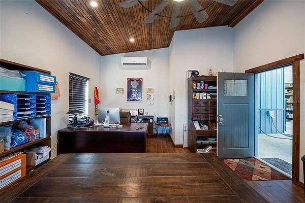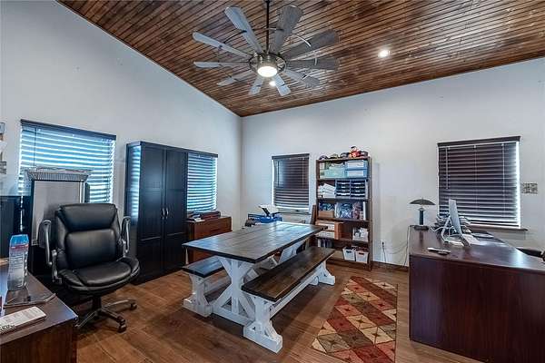 The oversized garage/barn includes a full kitchen, full bathroom, a spacious office, tack room, and abundant storage, plus an outdoor covered concrete pad. Irrigation is supplied by the private well.