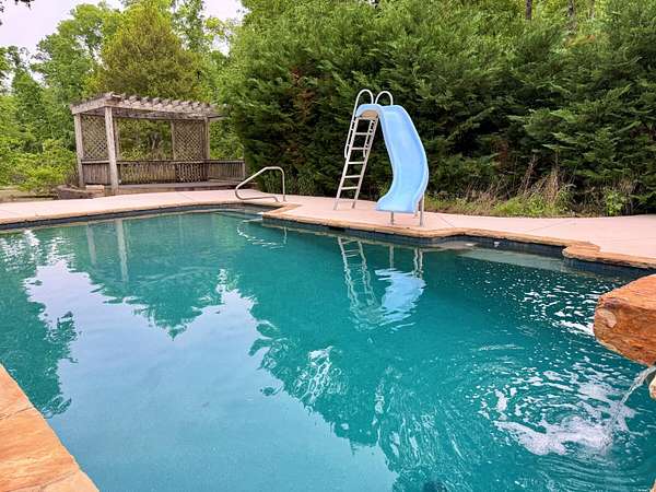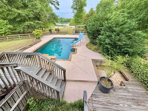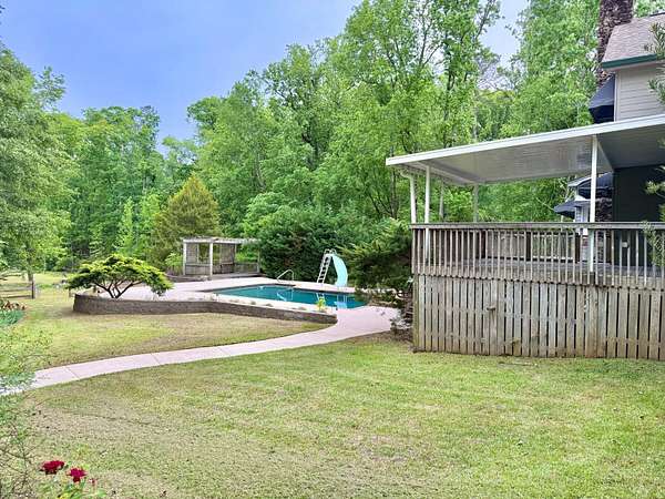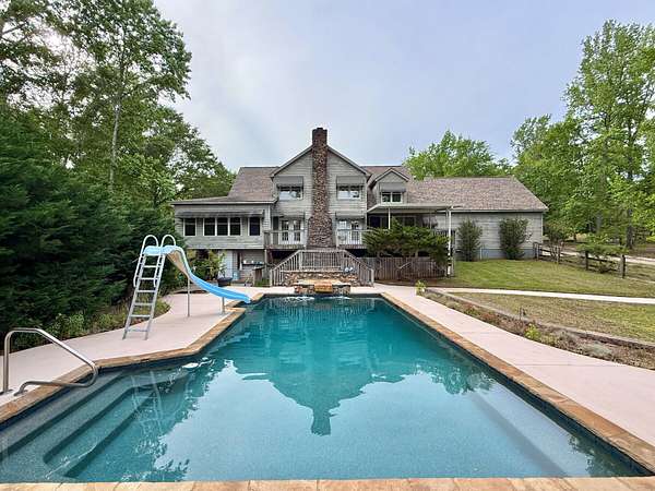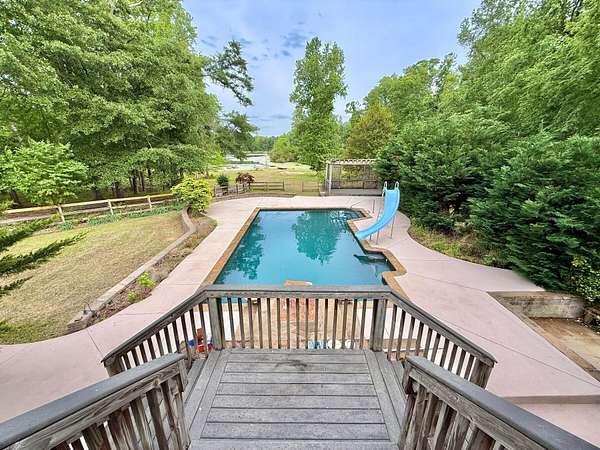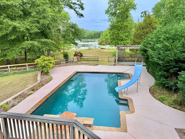 Welcome home to your peaceful, private retreat on 8.25 acres. Property is mostly fenced in with a powered gate. Private boat dock on a pond with bass and crappie. Out buildings include Horse barn and a very large workshop with two car bays, storage room, office and full bathroom inside. Large deck on the back of home with covered area. In ground Gunite pool by Pete Alewine with diving rock and water waterfall features. There is also an area to have a recessed hot tub as well. Under deck features a bar serving area, storage and an outdoor bathroom. Inside the home you will immdiately notice the enormous entryway and a cavernous two story great room with tons of natural light. Hardwood floors throughout main level are freshly refinished. Large front porch spans the width of the home. Kitchen with island, stainless appliances, Corian countertops, and bar area. Master bedroom with very large sitting area full of windows that bathe the room in natural light. Up the main stairs there are two bedrooms with large bathroom. Past the laundry room, the fourth bedroom is up the second set of steps. Only ten minutes to Riverwood Publix shopping center. Listing Broker is related to seller.