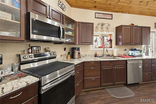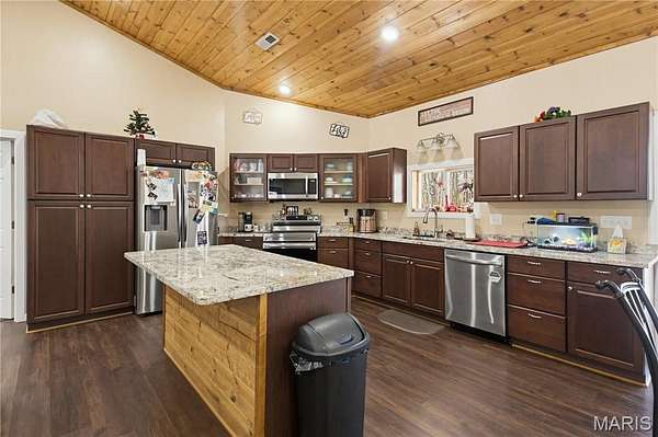 The living room features a vaulted wood ceiling, great natural light, and an open flow into the dining area and kitchen. You'll love the cabinet space, glass front accents, soft close drawers, and full appliance package with range, refrigerator, dishwasher, microhood, and air fryer oven.