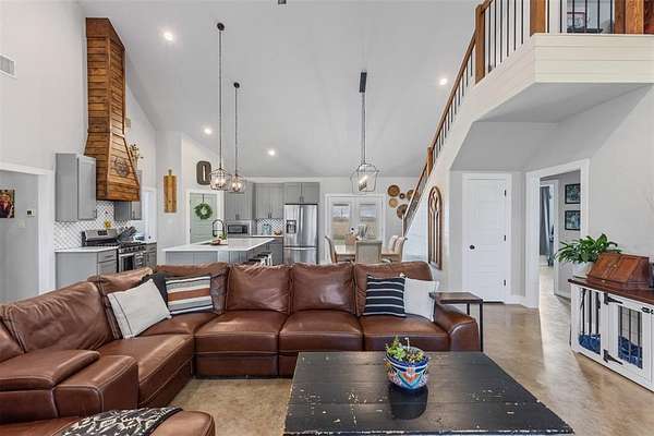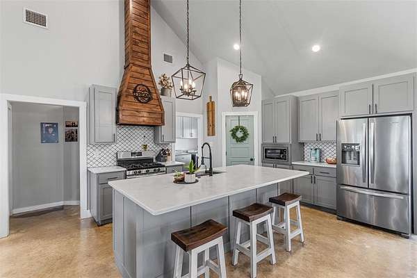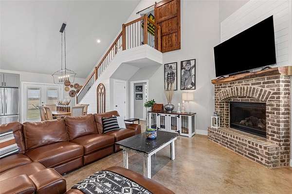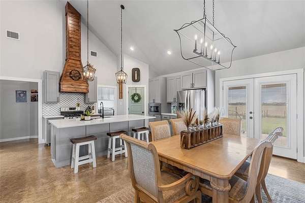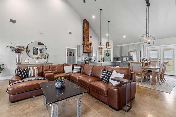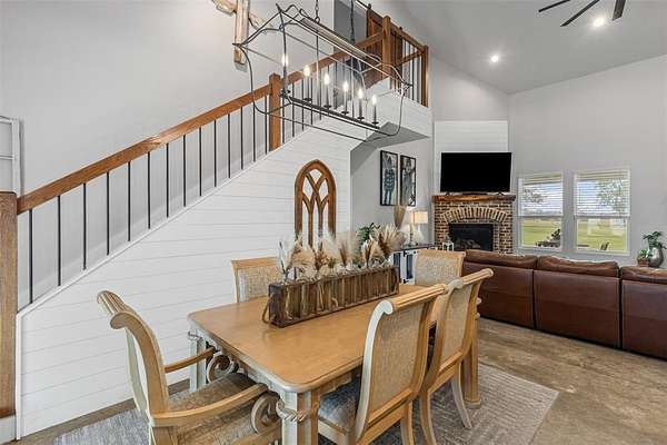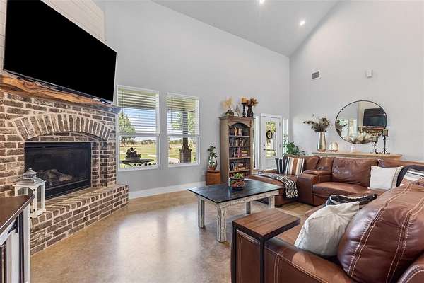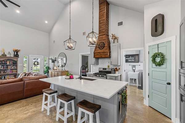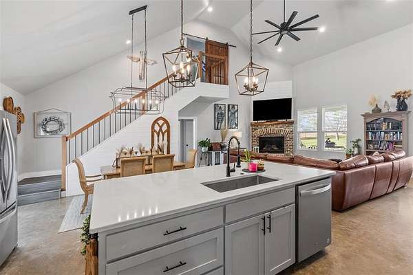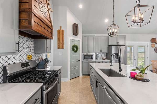 Step onto the spacious front or back porch and take in the serene countryside views. Inside, the open-concept design seamlessly connects the kitchen, dining, and living areas, centered around a cozy fireplace. The kitchen features quartzite countertops, gas appliances, and beautiful farmhouse-style light fixtures that add a warm, rustic touch.
