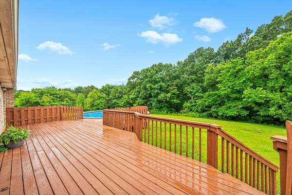 Welcome to this spacious home with over 2,500 square feet of living space, set on 5 unrestricted acres with county taxes only. BRAND NEW HVAC for upstairs just installed! - Located on a dead-end street, the property offers both open yard space and wooded areas for added privacy. A large covered front porch provides peaceful views of surrounding farmland. Inside, you'll find a picture-perfect kitchen with modern updates and a large dining area - perfect for gatherings! The main-level primary suite features a jacuzzi tub, step-in shower, and sliding glass doors leading to a large deck overlooking the pool. Upstairs, you'll find three generously sized bedrooms and a full bathroom. The main floor also includes a spacious utility room and a versatile bonus space. Recent updates include a new roof, new appliances, new carpet upstairs, and new flooring on the main level. Two-car basement garage and large detached garage so bring the toys! - Could this be YOUR forever home? Schedule your showing today!