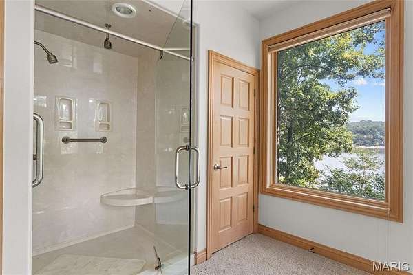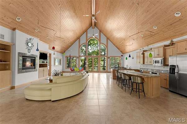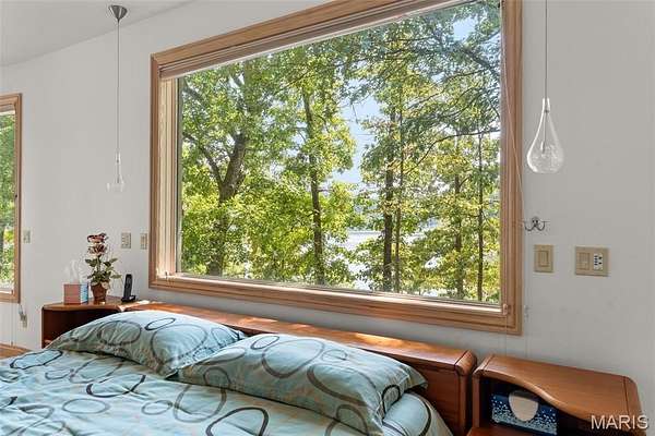 Perched on a private point along the shores of Table Rock Lake, this completely furnished 5,428 sq ft modern-designed home is all about sleek lines, open spaces, and jaw-dropping water views. Expansive walls of glass frame the lake from nearly every room creating a seamless blend of indoor and outdoor living. The open-concept design features soaring ceilings, clean architectural details, and a natural palette of stone and wood that mirrors the beauty of its surroundings. The kitchen flows effortlessly into spacious living and dining areas with a large capacity free standing ice maker. All backing up against the backdrop of endless lake vistas. Step outside to the deck where the horizon stretches across miles of sparkling water. A short drive down the road leads to a boat slip (36x10) on a community dock with a boat lift and a hanging boat cover installed to wrap and protect your boat. Need room for guests to visit during the summertime? No worries, above the detached garage with 3 parking spaces, 1/2 bath and a shop area is a 1,900 sq ft fully functioning, fully furnished, 4 bedroom and 4 bathroom guest house. This guest house is fun for the kids with a firepole extending from the loft to the main living area. This is more than a home--it's a statement of modern lakeside living, designed for those who value luxury, privacy, and panoramic beauty.