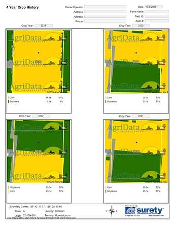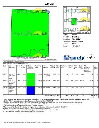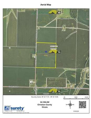 Est $6,000/moDo not miss this chance to own 50 acres of Class A Christian County farm ground. Farm has a PI of 141.6. with 90% Ipava, 9% Osco soil type. Sold in 2 parcels ( 10-04-32-300-002-00 40 acres & 10-04-32-100-004-00 10 acres). Currently rented through end of harvest 2026.