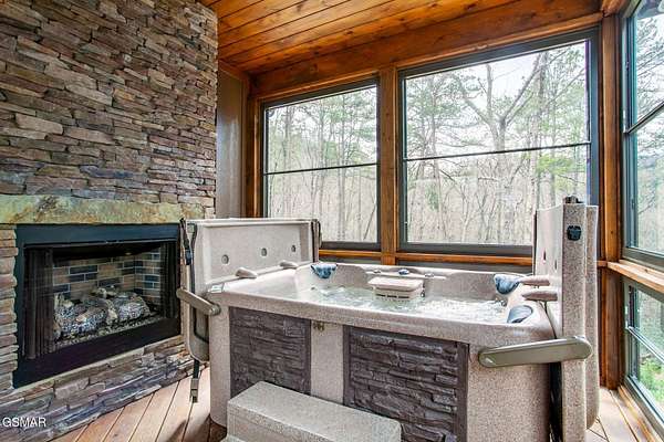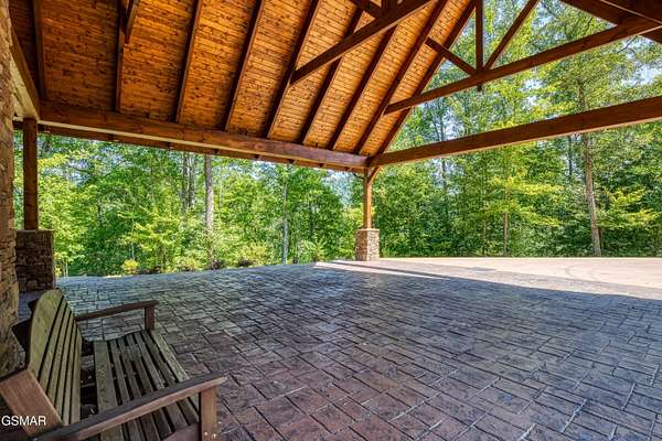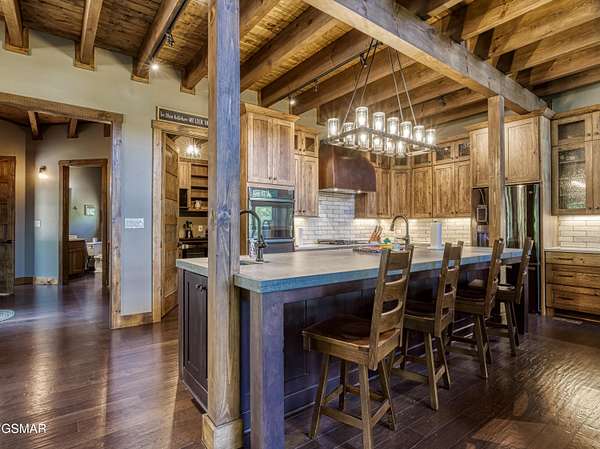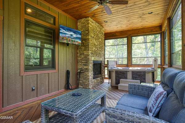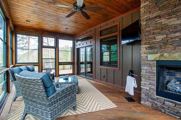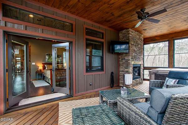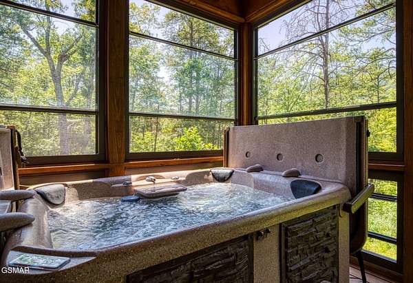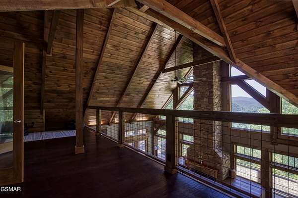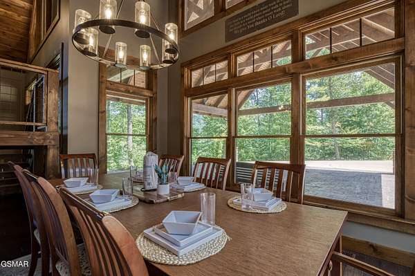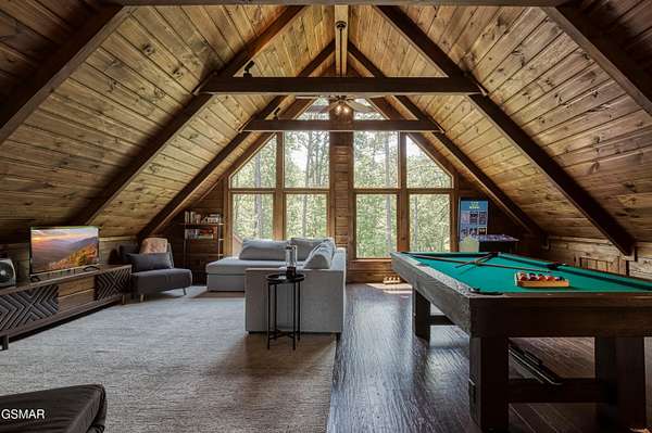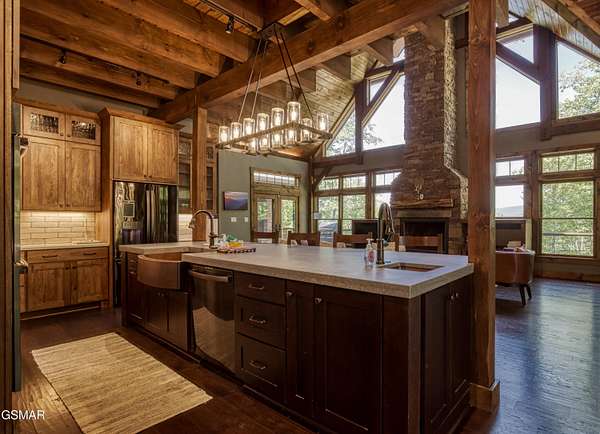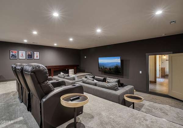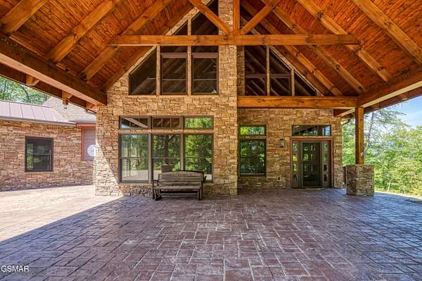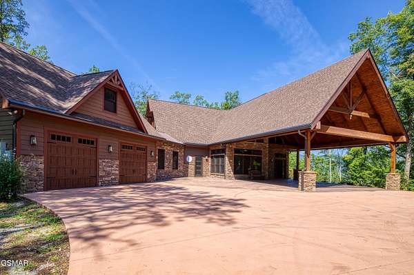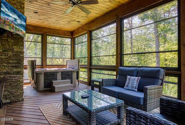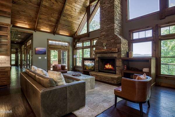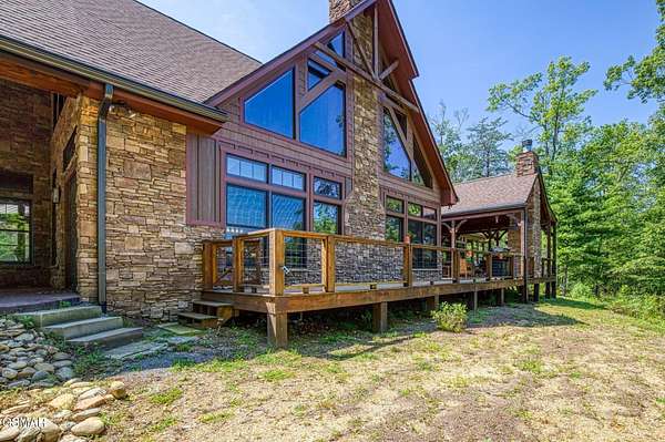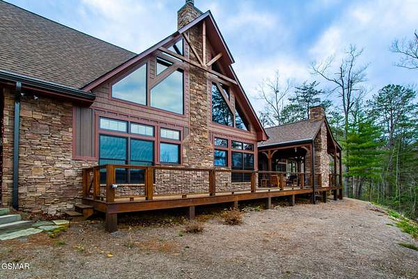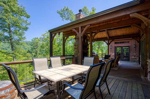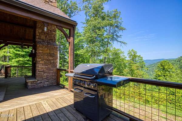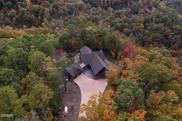 Where luxury meets Smoky Mountain grandeur. Mountain Living at Its Finest. Privately positioned at the center of 15 acres, this timber-framed luxury mountain retreat delivers exceptional craftsmanship, privacy, and panoramic mountain views. Built in 2020 with no expense spared, the home is designed for refined indoor-outdoor living and elevated entertaining. The residence features three en-suite bedrooms, a spacious loft currently used as a game and entertainment space, and four spa-inspired bathrooms. A designer kitchen anchors the main living area with solid-surface concrete countertops, premium appliances, and an oversized walk-in butler's pantry, offering both functionality and luxury. Outdoor living is truly resort-level. A private owner's deck includes a bubbling hot tub, stacked-stone gas fireplace, and TV. The primary deck offers both covered and open-air living, highlighted by a stacked-stone wood-burning fireplace, outdoor TV, and sweeping mountain views. Multiple fully opening interior doors create a seamless indoor-outdoor experience ideal for entertaining. An 800+ square-foot custom designed private media room, fully heated and cooled, provides an exceptional entertainment space suitable for year-round enjoyment. Architecturally, the home showcases a refined timber-frame design blending rustic mountain character with modern luxury. Exposed beams, stacked-stone accents, and expansive glass frame the surrounding Smoky Mountain landscape while delivering a dramatic yet warm aesthetic. Currently operating as a successful short-term rental, the property offers an excellent rental history and an established base of repeat guests already in place-providing immediate income potential without sacrificing its appeal as a luxury second home. Additional features include an integrated whole-home generator, private gated entrance, and a comprehensive whole-home water treatment system with mechanical filtration, brine tank, ultraviolet purification, and reverse osmosis system with a three-stage filter and four-gallon storage tank. A striking 30' x 30' covered motor court creates a grand arrival experience with full timber framing, accent lighting, oversized ceiling fan, and stained, stamped concrete flooring. The property is accessed by a long, illuminated private drive and includes an outdoor storage shed for added functionality. A rare offering combining privacy, architectural distinction, and proven performance-ideal as a premier second home or high-end short-term rental investment in the Smoky Mountains.