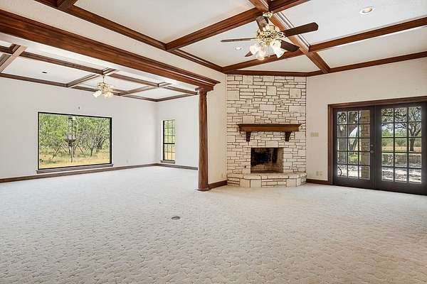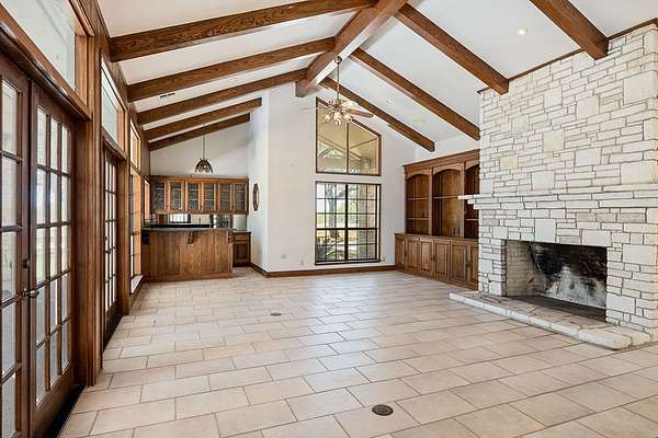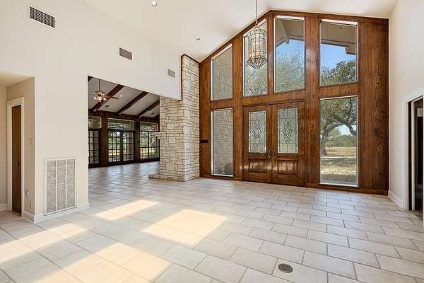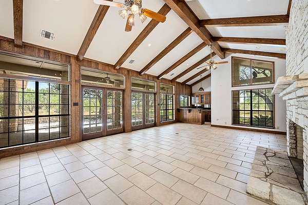 Tucked away on a private hilltop, this elegant 4,900+/- sq ft, 4-bed, 4-bath home offers rare privacy, timeless style, and sweeping views of the South Texas countryside. A gated entrance off a paved FM road leads you down a scenic half-mile paved drive, winding through mature oaks and native brush before revealing a peaceful private lake and, beyond it, the striking residence above. Smaller acreage options might be available. Call Broker to discuss further! Located less than an hour south of San Antonio via I-37 and just 20 minutes from Pleasanton and Floresville, the property combines serene country living with convenient city access. It lies within the Pleasanton ISD, ideal for families seeking a rural lifestyle without sacrificing community resources. Built in 1980 and remodeled in 2010, the stone home features an A-frame glass front, Palladian windows, cathedral ceilings, and a floor-to-ceiling stone fireplace. The open-concept design includes a formal dining area, large living room, walk-behind bar, and panoramic eastern views from a wall of windows. The spacious kitchen includes granite counters, rich wood cabinetry, dual dishwashers, a center island, and double ovens. The oversized primary suite has its own fireplace, porch access, dual closets, and a large bath. Two guest bedrooms share a full bath, while a fourth suite-accessible via sunroom-offers private entry. An additional air-conditioned craft room or office provides extra flexibility. Surrounding the home are over 20 mature oak and mesquite trees, set within 175 acres of prime South Texas brushland. A branch of Borrego Creek, a 3-4 acre lake, and a second stock tank support abundant wildlife, including whitetail, hogs, dove, and quail. Cross-fenced into four pastures, the ranch also holds grazing potential and scenic beauty. This unique property blends natural charm, recreational opportunity, and refined living in one private setting.