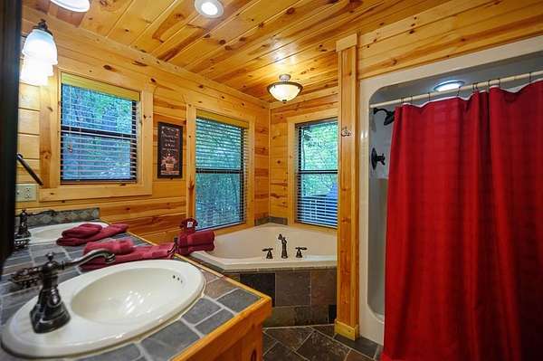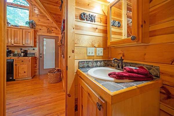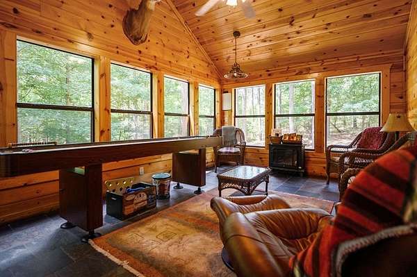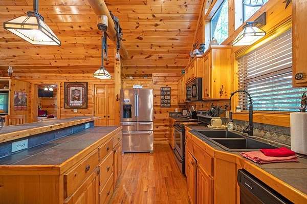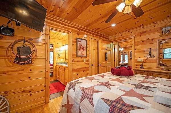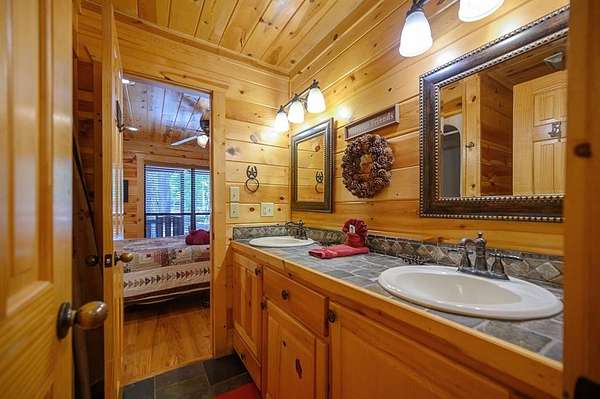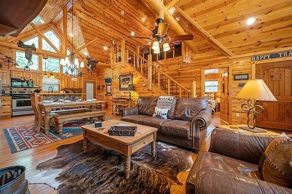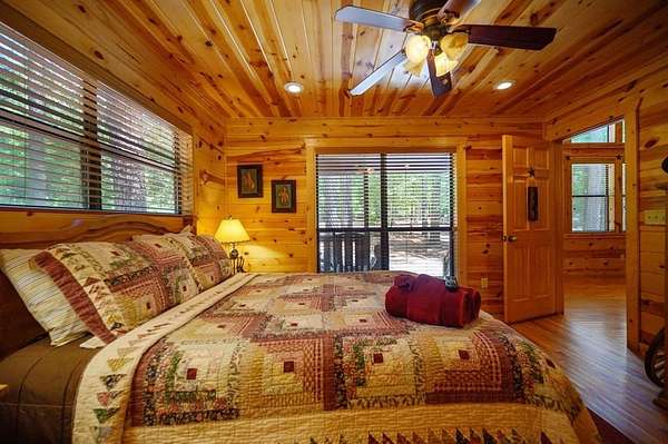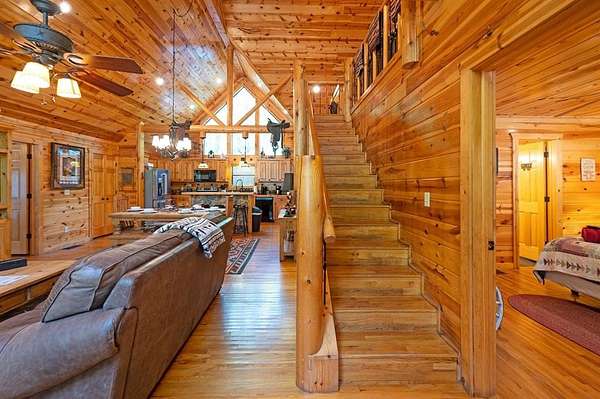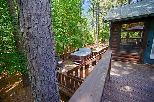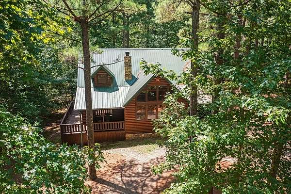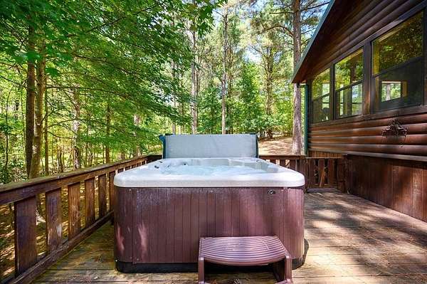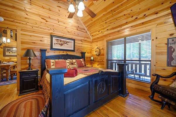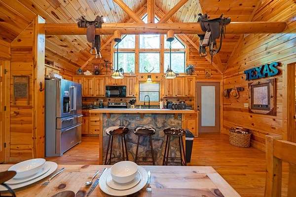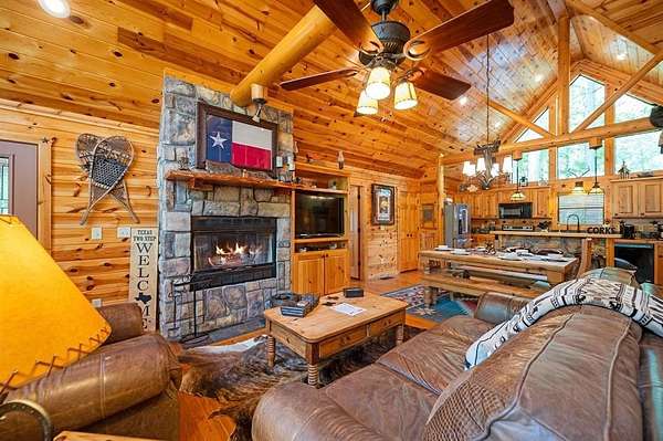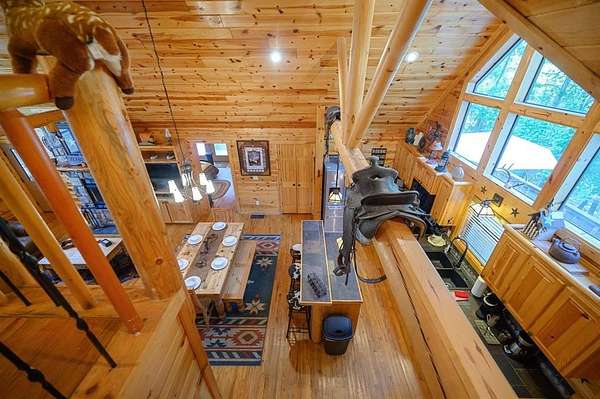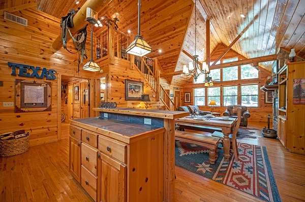 Texas Two-Step is the perfect way to spend time relaxing and be surrounded by nature. Sitting on just over 2 acres, this 2 story cabin features 3 bedrooms, 2.5 baths, with an upstairs loft, enclosed patio, and playground. Texas Two Step luxury cabin has over 2,000 square feet of living space and can sleep many people comfortably. As you step inside, you're greeted by vaulted ceilings and gable windows on the front and back side of the cabin. The living, dining, and kitchen area are the central portion of the cabin with the bedrooms arranged on either side. The living area features a built-in entertainment center and authentic woodburning stone fireplace as well as comfy seating for family and friends. All bedrooms and bathrooms are located downstairs with a loft upstairs featuring a bunk bed, foosball table, and TV. The master suite has French doors leading outside to a limited access deck which can be opened to offer a view from the comfort of the king size bed. You'll find an enclosed sunroom with shuffleboard and casual lounge seating off the back of the kitchen that leads outside to the back deck. The back deck features a grill with patio seating and access to a lower deck which offers a hot tub and views of the surrounding forest. A notable attribute of this location is the abundance of outdoor space which features a playground for the kids and a fire pit. With the extra acreage the property has much more space to create more entertaining outdoors for family fun!