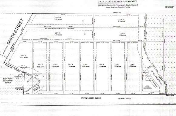 Welcome to Twin Lakes Estates, a newly platted neighborhood in the heart of Eastpoint, Florida. This pristine 1 acre (or more) lot offers a unique opportunity to build your dream home in a serene and picturesque setting. Nestled amidst natural beauty, Twin Lakes Estates provides a tranquil retreat while still being conveniently located near local amenities and attractions. No HOA but Deed Restrictions do apply. Whether you're looking to build a permanent residence or a vacation getaway, Twin Lakes Estates offers the perfect blend of seclusion and accessibility. Don't miss out on this rare opportunity to own a piece of paradise in Eastpoint, Florida. No mobile homes are allowed. Lots are marked along the right of ways on survey markers...see lot numbers. Give us a call today!