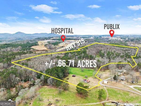Est $7,754/moOver 66 acres w/approximately 1,100 ft. frontage on Hwy 515. Across from hospital and new medical buildings. Great mixture of hardwoods, open pasture and flowing creek on property. Great acreage for private estate homes or hobby farm. Multiple possibilities.