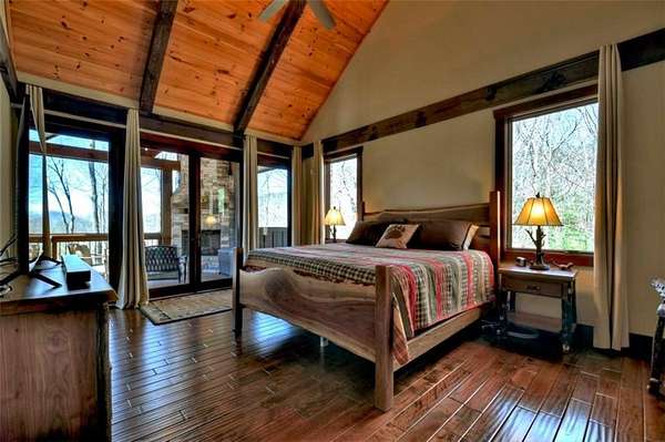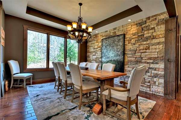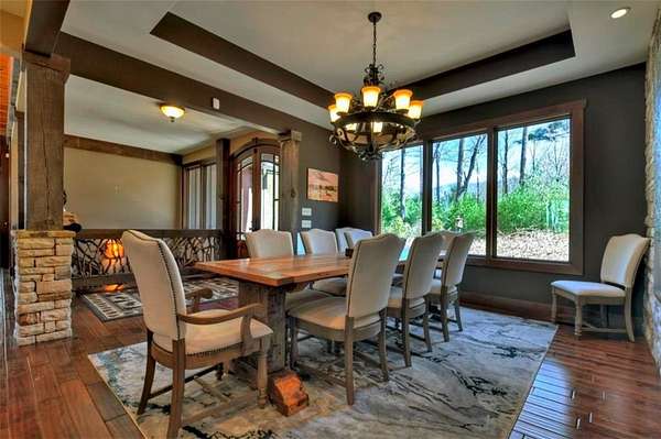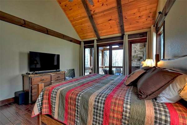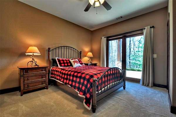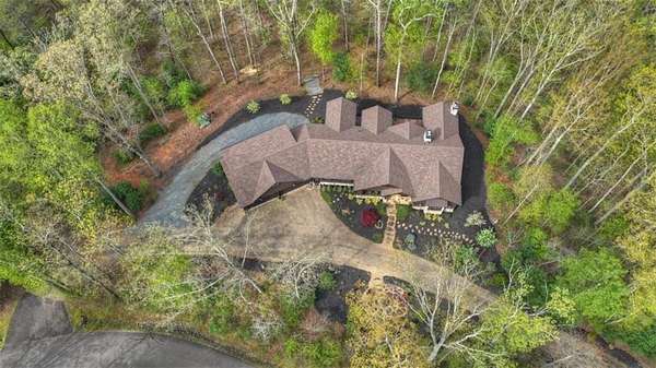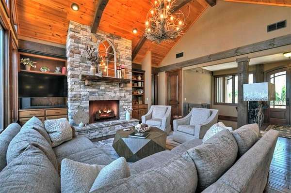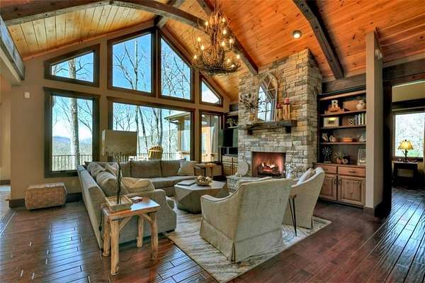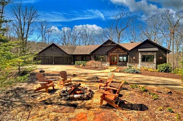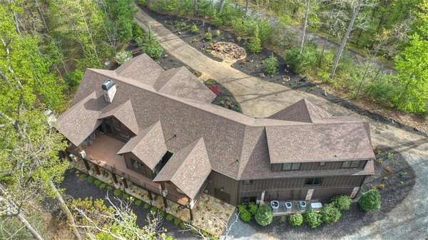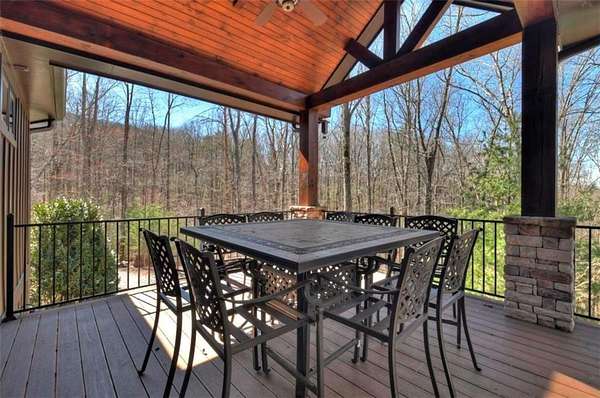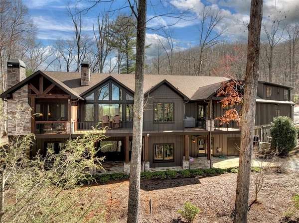 Timeless Mountain Luxury! 5 Bedroom/5 Bath Lodge-Style Retreat in *The Hemlocks*, privately set on 5 acres with long-range MOUNTAIN VIEWS. Inside, hand-scraped Siberian wood floors, soaring ceilings, and three stone fireplaces with black walnut mantels showcase extraordinary craftsmanship, while the chef's kitchen boasts custom knotty alder cabinetry, exotic granite, high-end appliances (including a brand-new refrigerator), pot-filler, and walk-in pantry. A spacious dining area with oversized windows and a dramatic stone accent wall creates an inviting gathering space. ALL BEDROOMS ARE EN-SUITE, including the main-level primary with dual closets, spa-like bath, and private access to the screened porch with outdoor fireplace. The finished terrace level offers a family room with fireplace, second kitchen, game area, 2 guest suites, plus a 5-seat home theatre wired for 9-channel surround (also designed as a safe room). Upstairs features a private guest suite and a huge bonus room with wet bar. Outdoor living abounds with 790+ sq ft of decks/porches plus a screened lounge with fireplace. Extras include a 4-car garage with EV charger, generator, water filtration system, private well with new pump, fiber internet, and 3-zoned HVAC. A gentle babbling brook adds charm to the wooded acreage. (Adjacent 5 acre lot is available for additional cost.) *The Hemlocks* is a hidden gem-an intimate gated community of only 20 estate lots (5+ acres each), known for big views, pristine privacy, and one of the most scenic drives in Ellijay along Turniptown Road as it meanders alongside Turniptown Creek. This home is just 15 minutes to town yet you will feel worlds away, with hiking and mountain adventures right outside your door. No STRs.