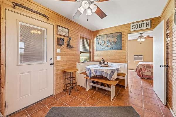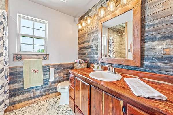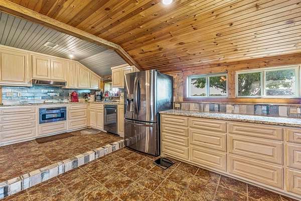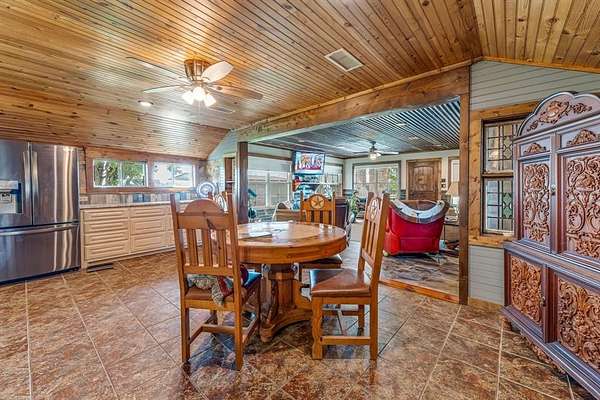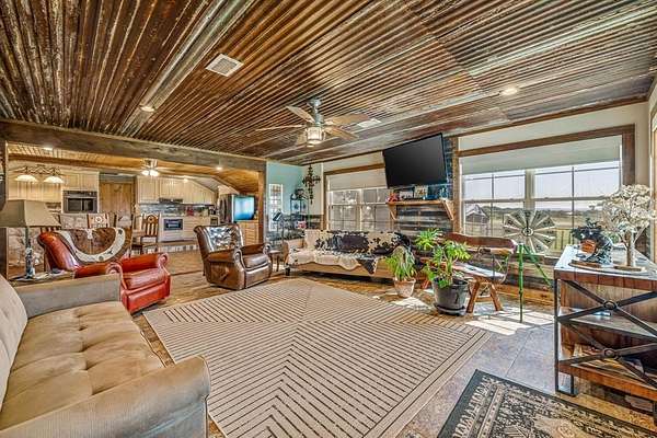 The main house offers 2 bedrooms and 3 baths, showcasing thoughtful craftsmanship throughout. Highlights include authentic stonework in the kitchen, wood-vaulted ceilings, tin ceilings in the living room, tile flooring, and large windows that provide scenic views of the landscape. The open-concept layout connects the kitchen, dining, and living areas.