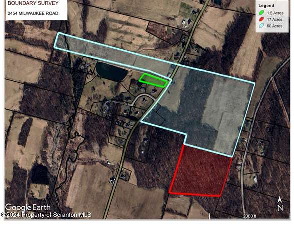 Est $9,951/moTwo parcels; 76-78 acres of land in the sought after Clarks Summit area, sold with an adorable 1100sq ft, 2 bedroom 1 bath farmhouse, oversized garage, and once functional dairy barn. Garage is currently under lease and income producing, farmhouse is on month to month lease and is also income producing. Recent survey available upon request. A developers dream come true!